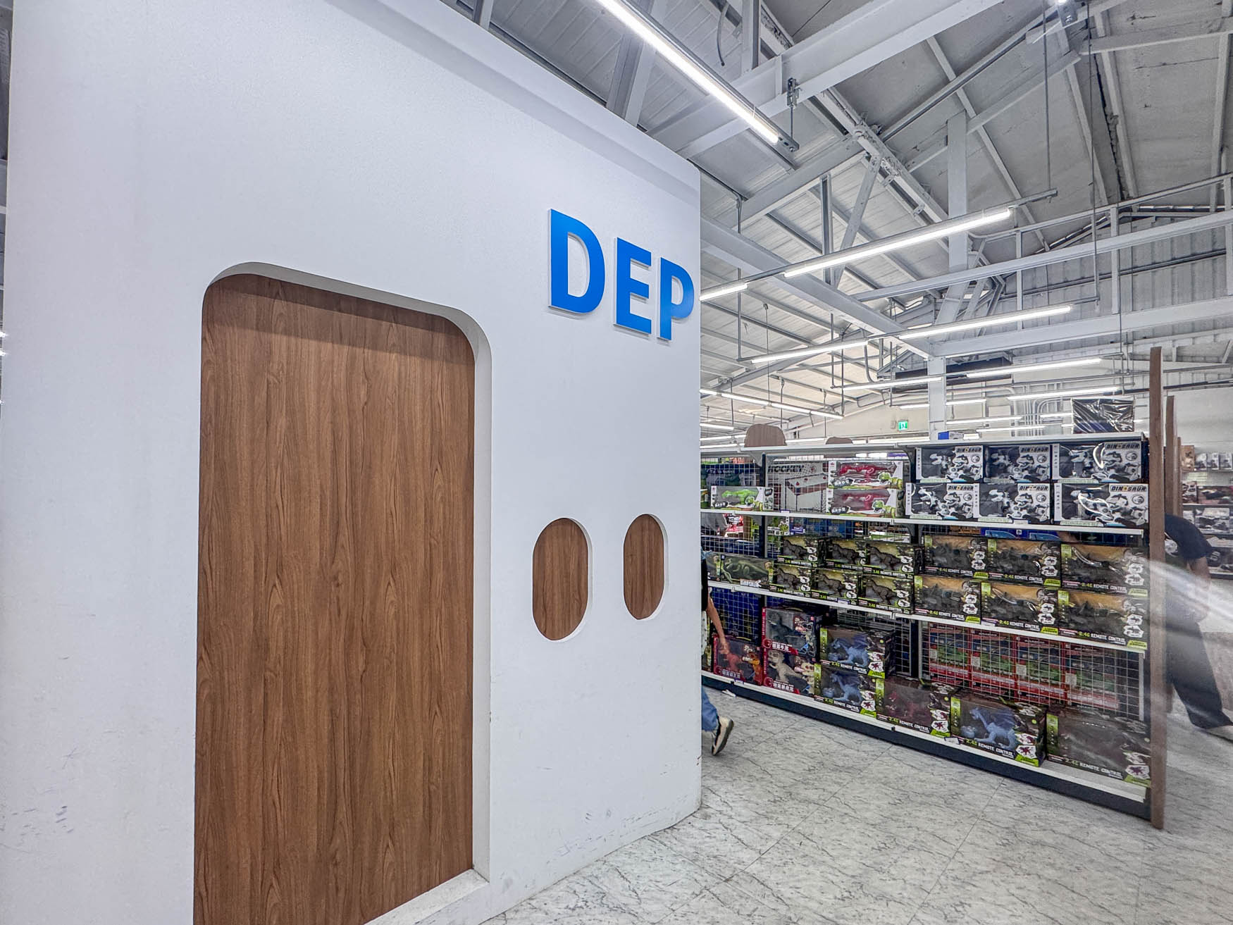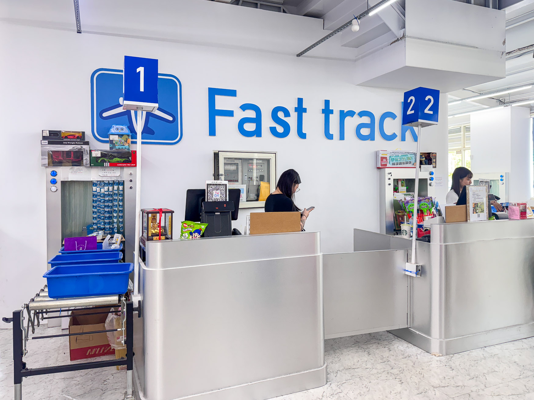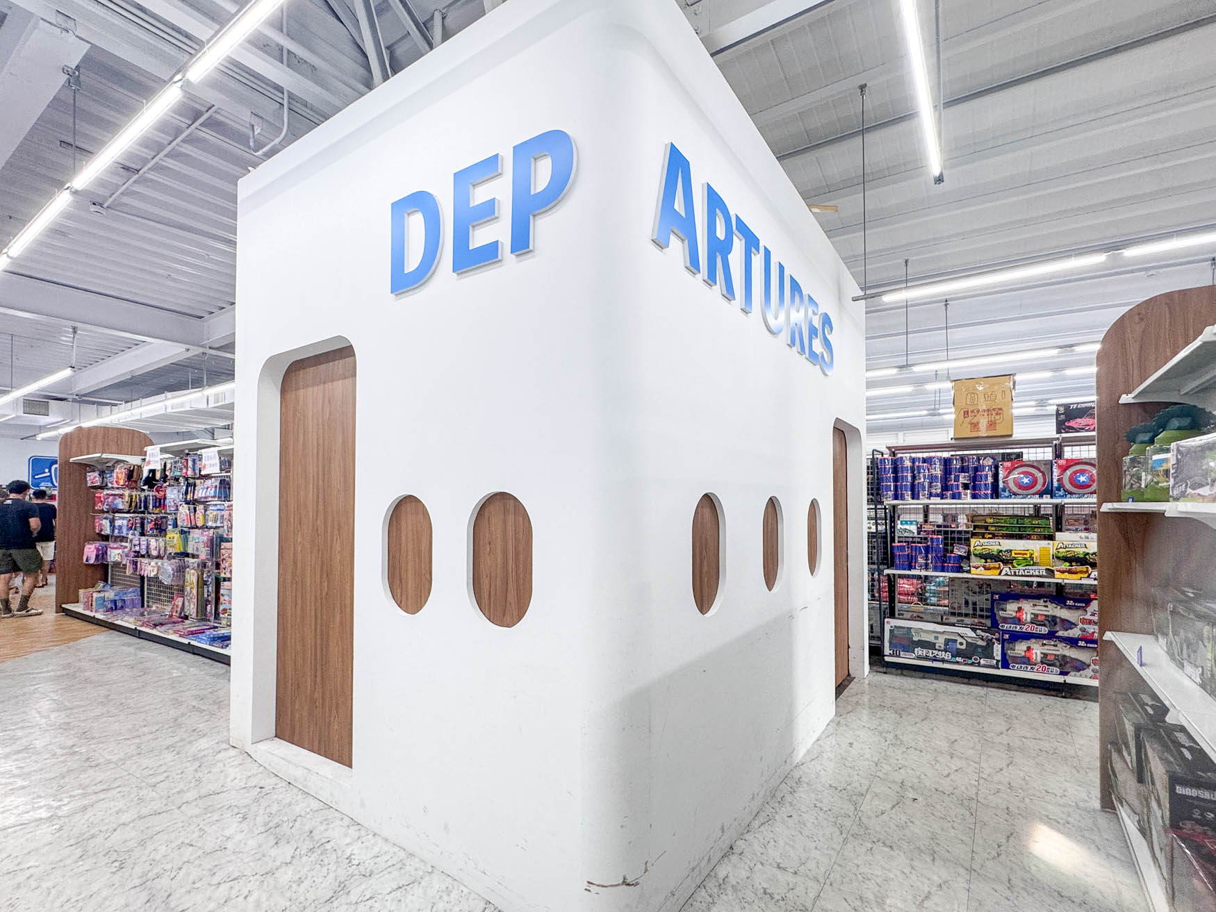 櫃台的設計延續整體「機場通關」主題,整排以登機櫃台造型打造,連指示燈牌、通關標誌、行李輸送帶等都設計得逼真,讓整個購物體驗更有臨場感。