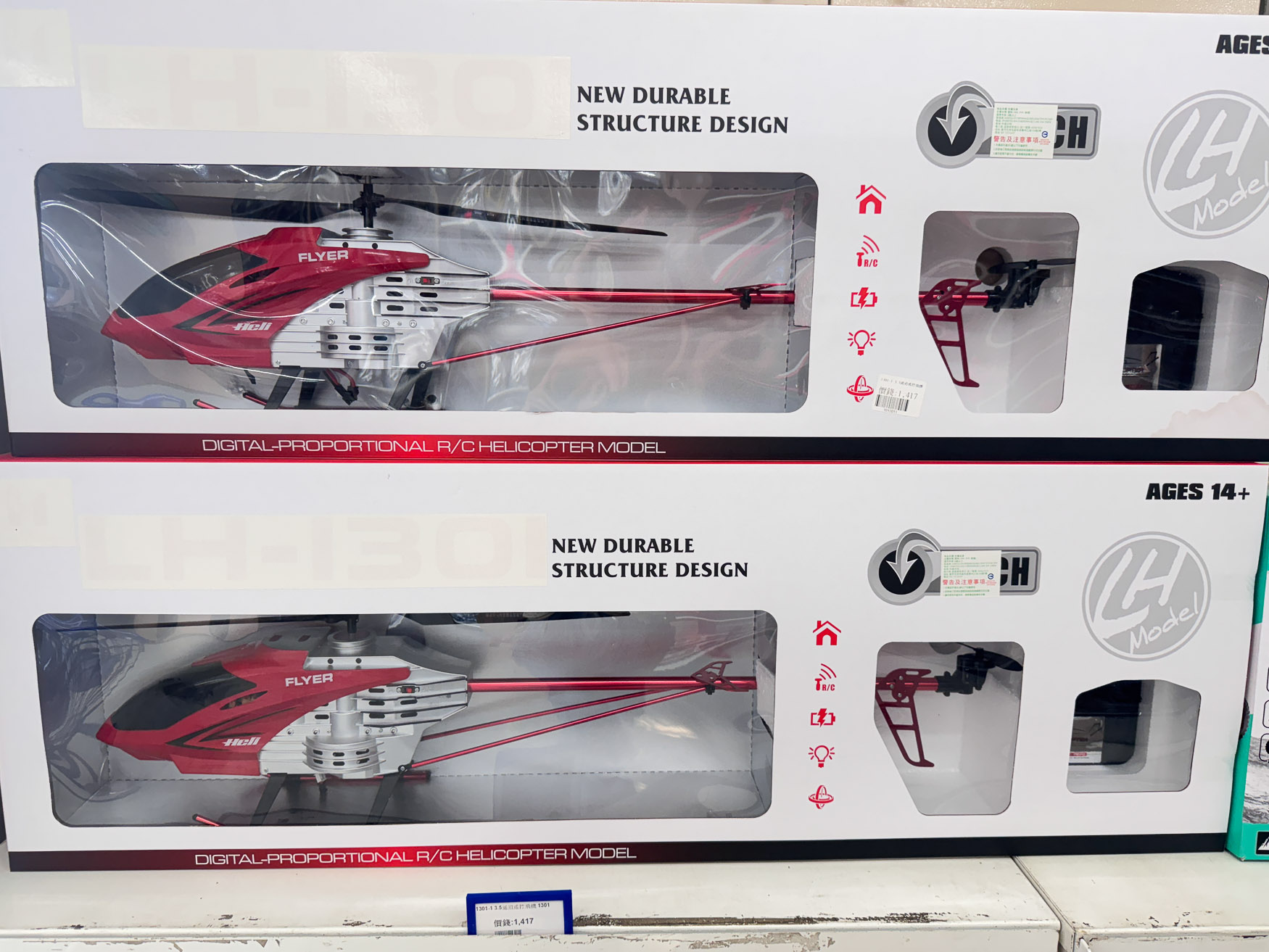店內販售的品項包含遙控汽車、飛機、越野車、戰鬥陀螺車等熱門品項,從入門款到專業款都有。價格約落在 300 元至 2000 元不等。