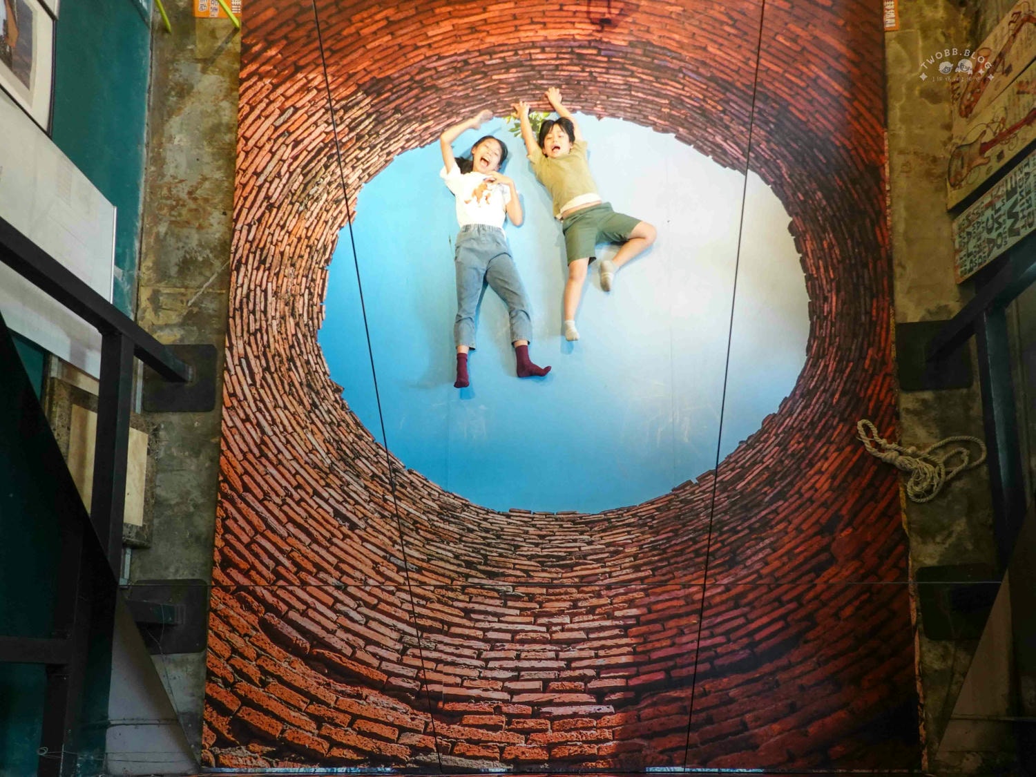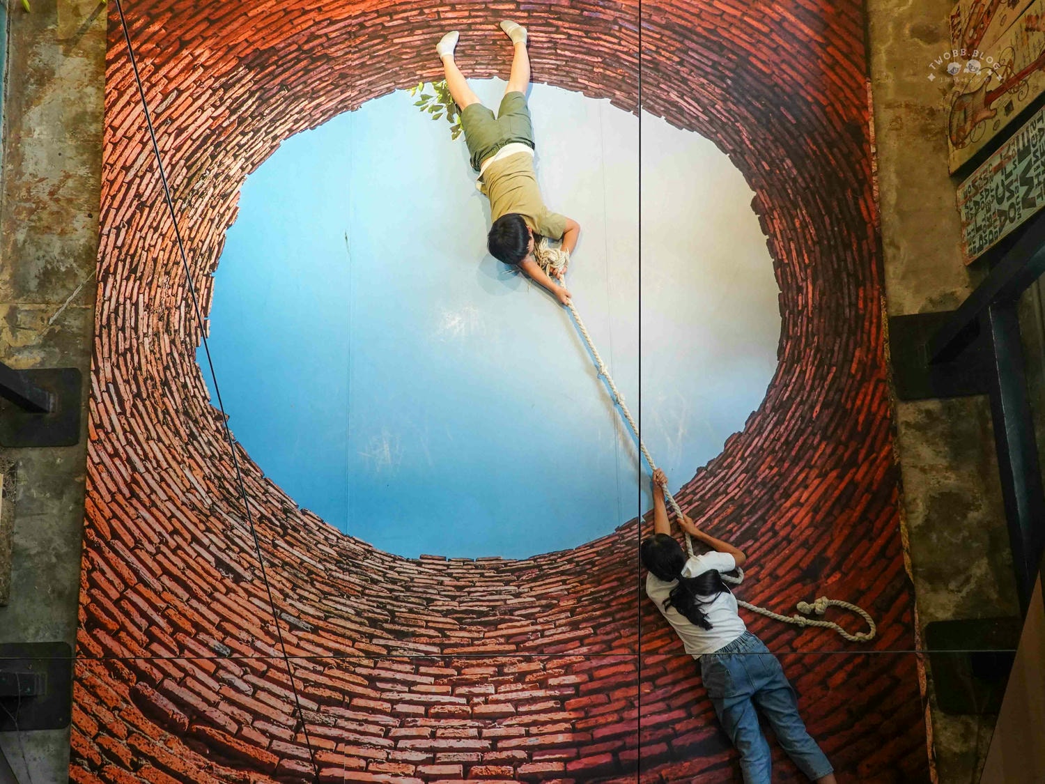 最好玩的是這個3D仿真古井地畫,利用鏡子折射呈現人在井內與井外的景象,一旁還有繩子當道具,發揮你的想像力拍出酷炫的照片!