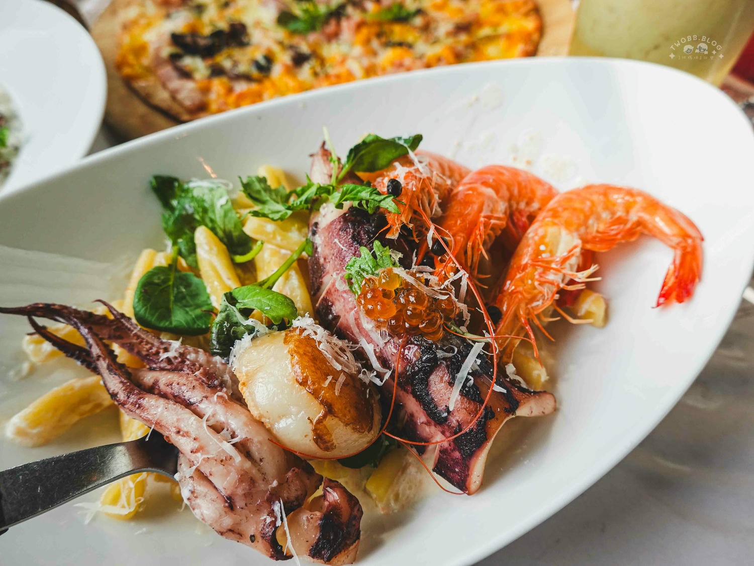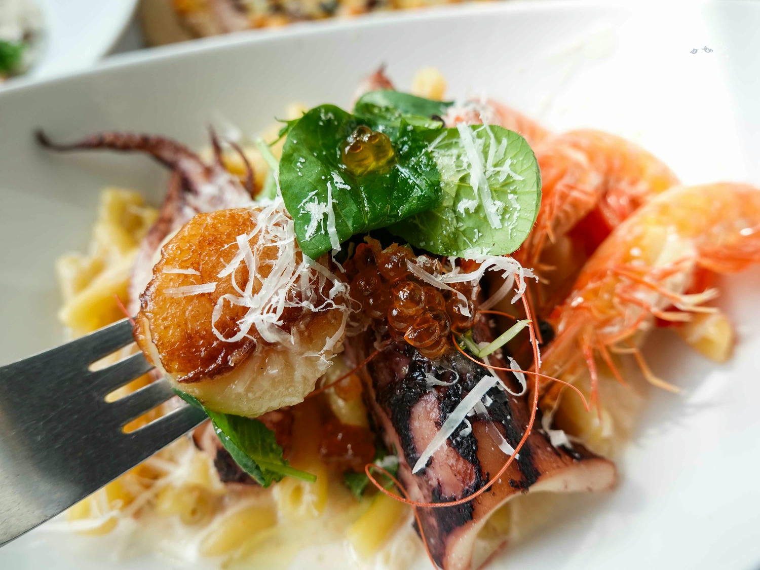 喜歡吃海鮮的朋友,我就大推這道給你!滿滿海鮮與灑落在義大利麵上的明太子香氣十足,整條小卷與大顆干貝更是令人驚喜。