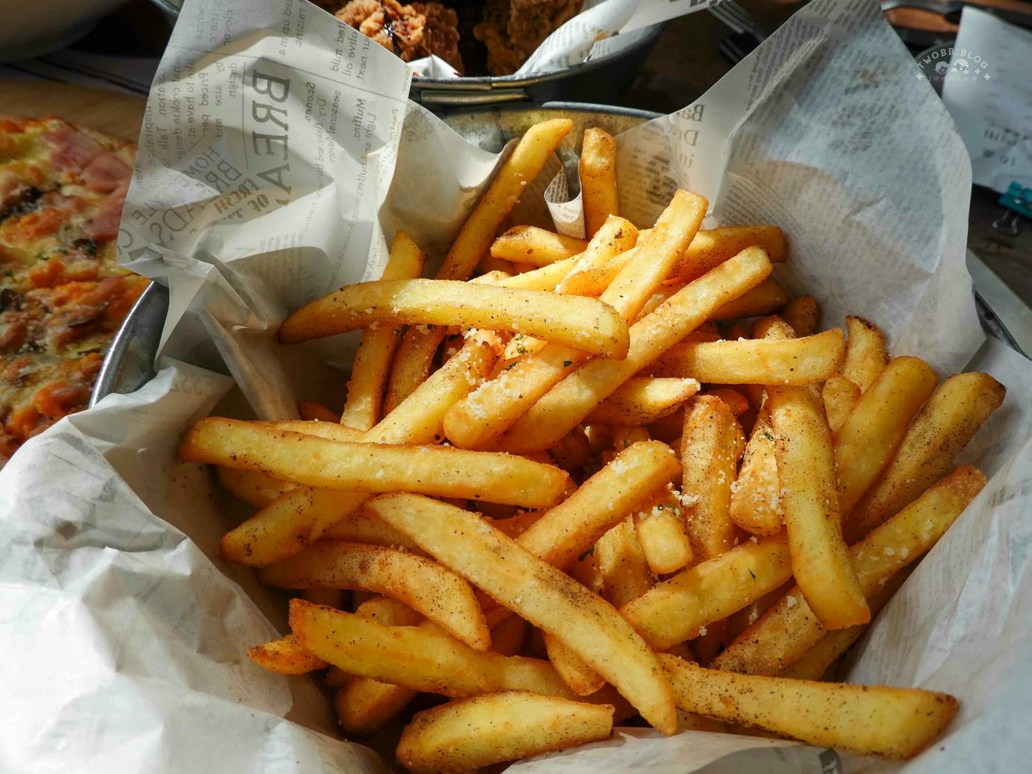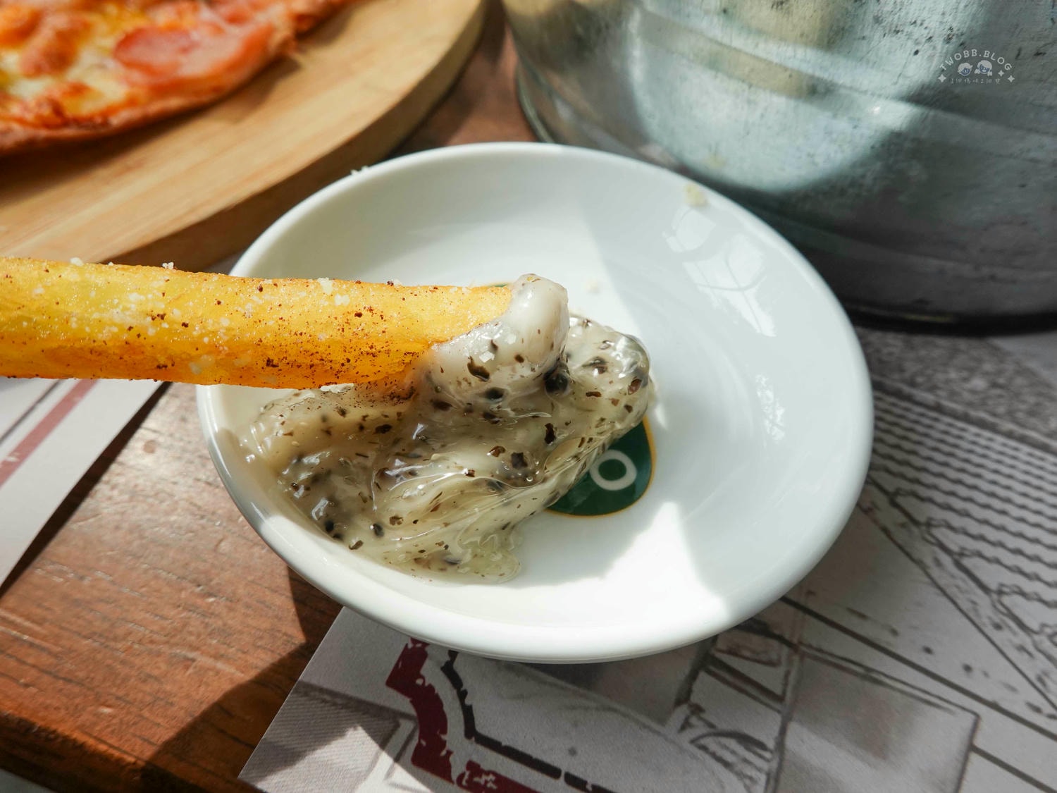 香脆金黃薯條撒上些許香料粉更能增添風味,搭配帶點酸勁的松露醬也很好吃。不管是單吃或是沾醬都有不同風味。