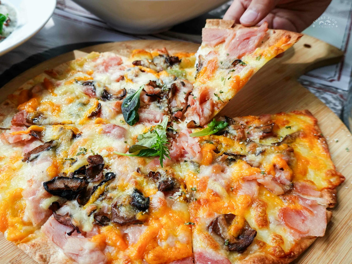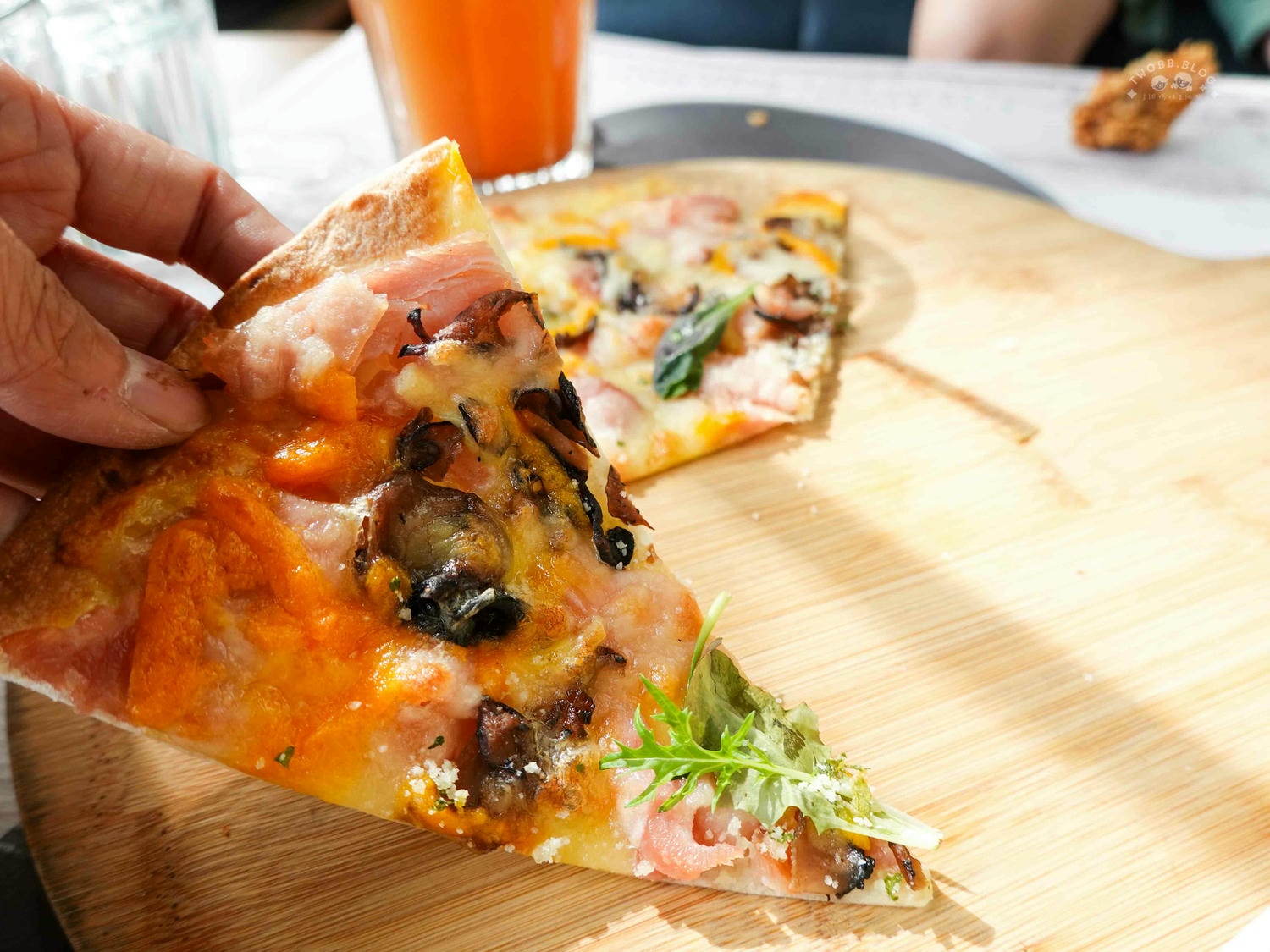 雖然妮叡不吃菇,但這道薄餅他們可是相當賞臉。沒有兩三下馬上就清空一塊不留。薄餅厚度相當適口烤得有點脆脆口感相當迷人,鹹香起司搭配燻味火雞實在太涮嘴了。