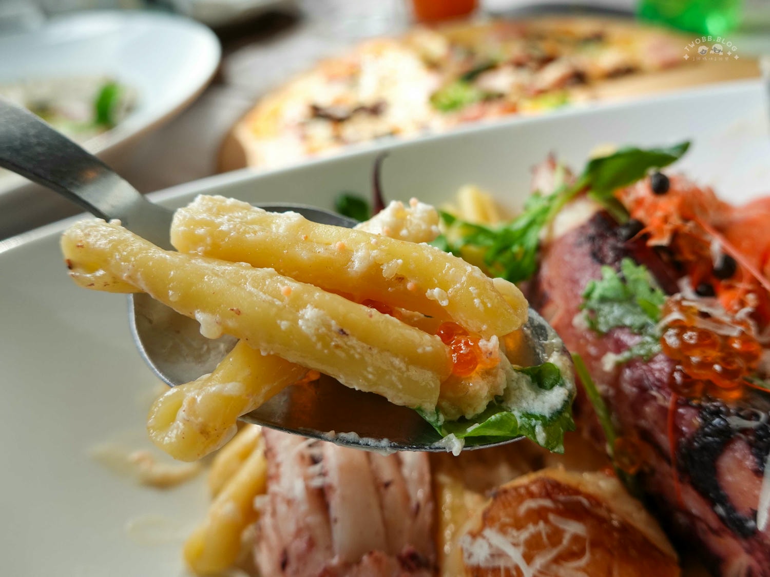 每條麻花捲麵巴著濃郁白醬,入口依稀能感覺明太子在嘴裡不斷游移,形容是滿口鮮味也不為過。麻花捲麵是我愛的那種QQ有咬感的風味,非常喜歡!