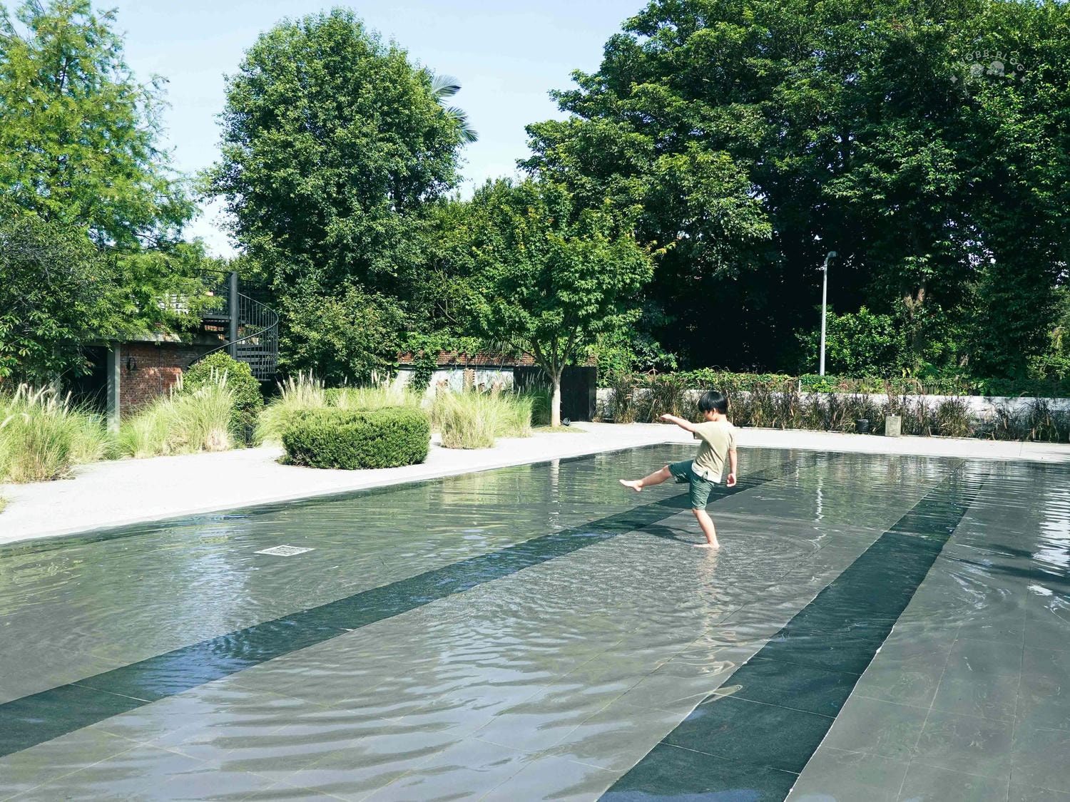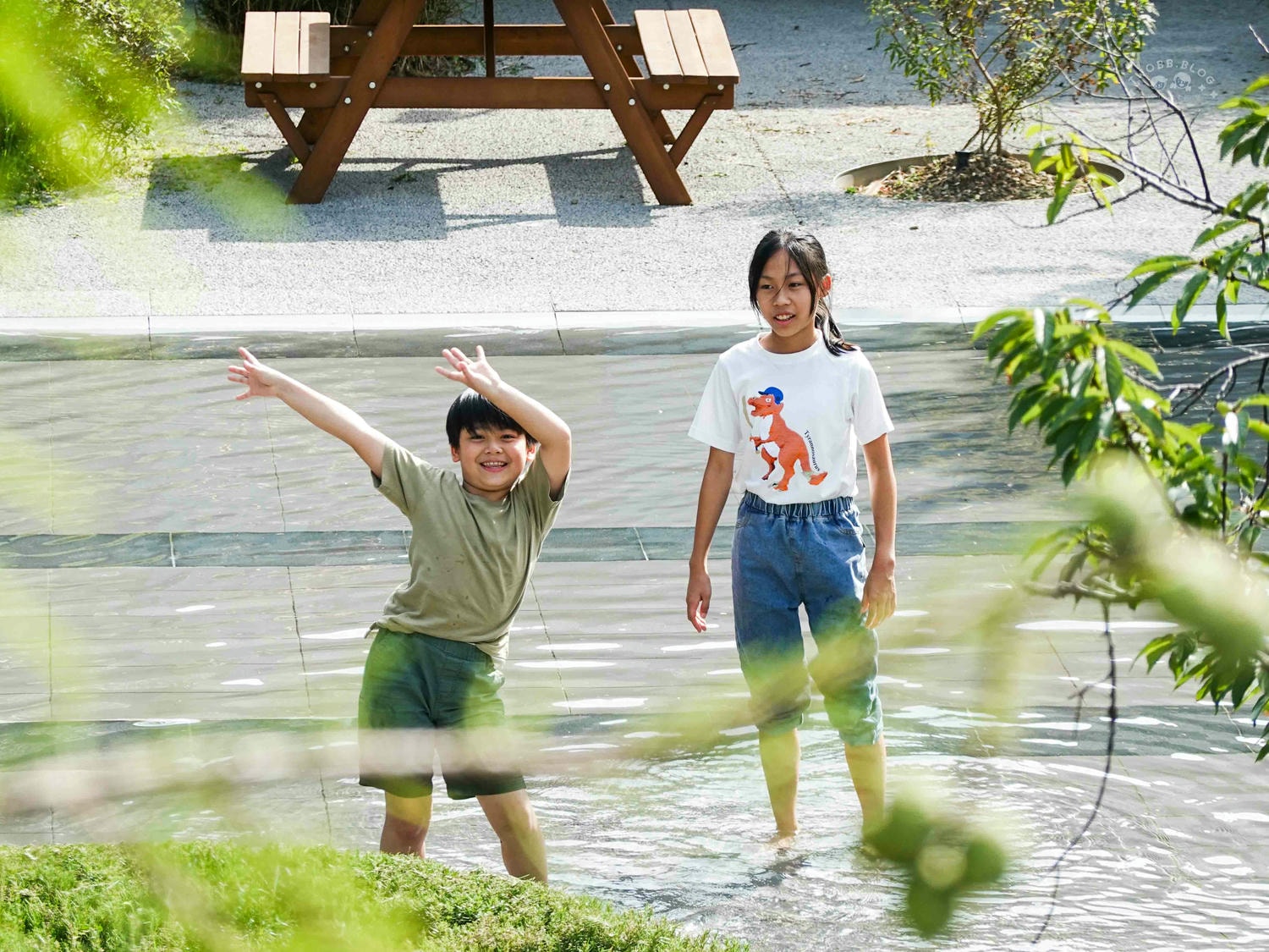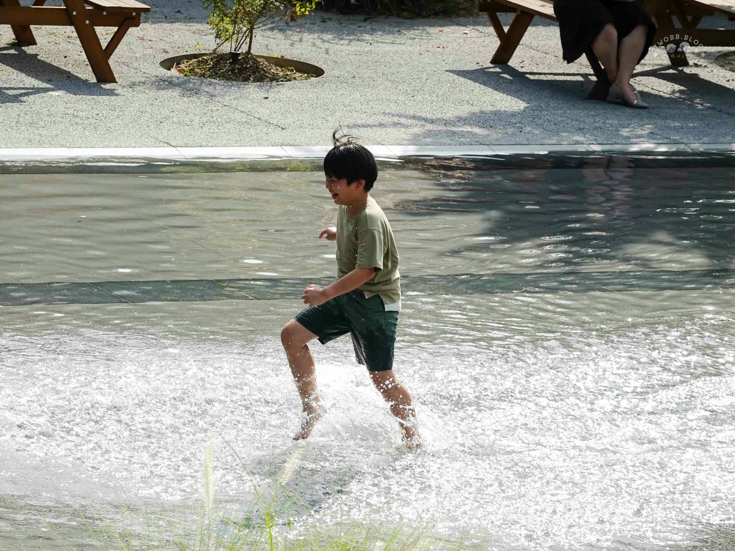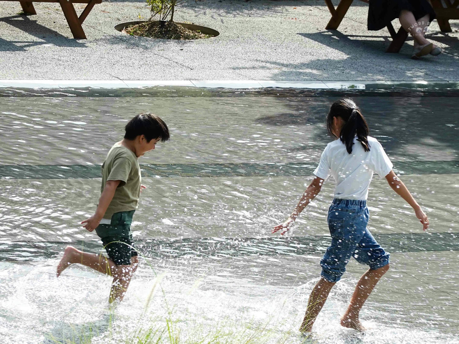 不過這天氣最適合讓孩子在這片淺池區玩耍,孩子們總是能在歡笑中找到不同的玩樂方式,只見他們姊弟追來追去,你踢水給我、我再踢回去這種循環就能玩上不少時間。