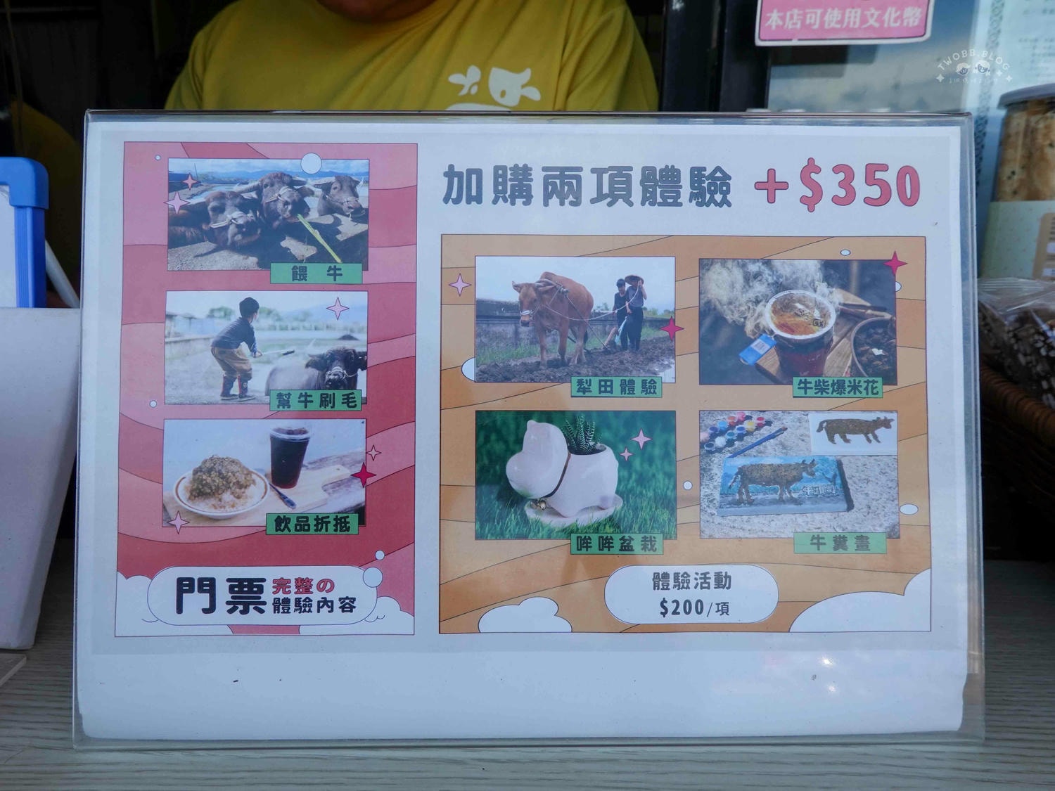 入場門票全票為150元;半票為75元。票券體驗內容含餵牛、洗牛(夏季限定)、幫牛梳毛。全票還可折抵50元消費。加價還能額外體驗犁田、盆栽、牛糞畫以及牛柴爆米花。