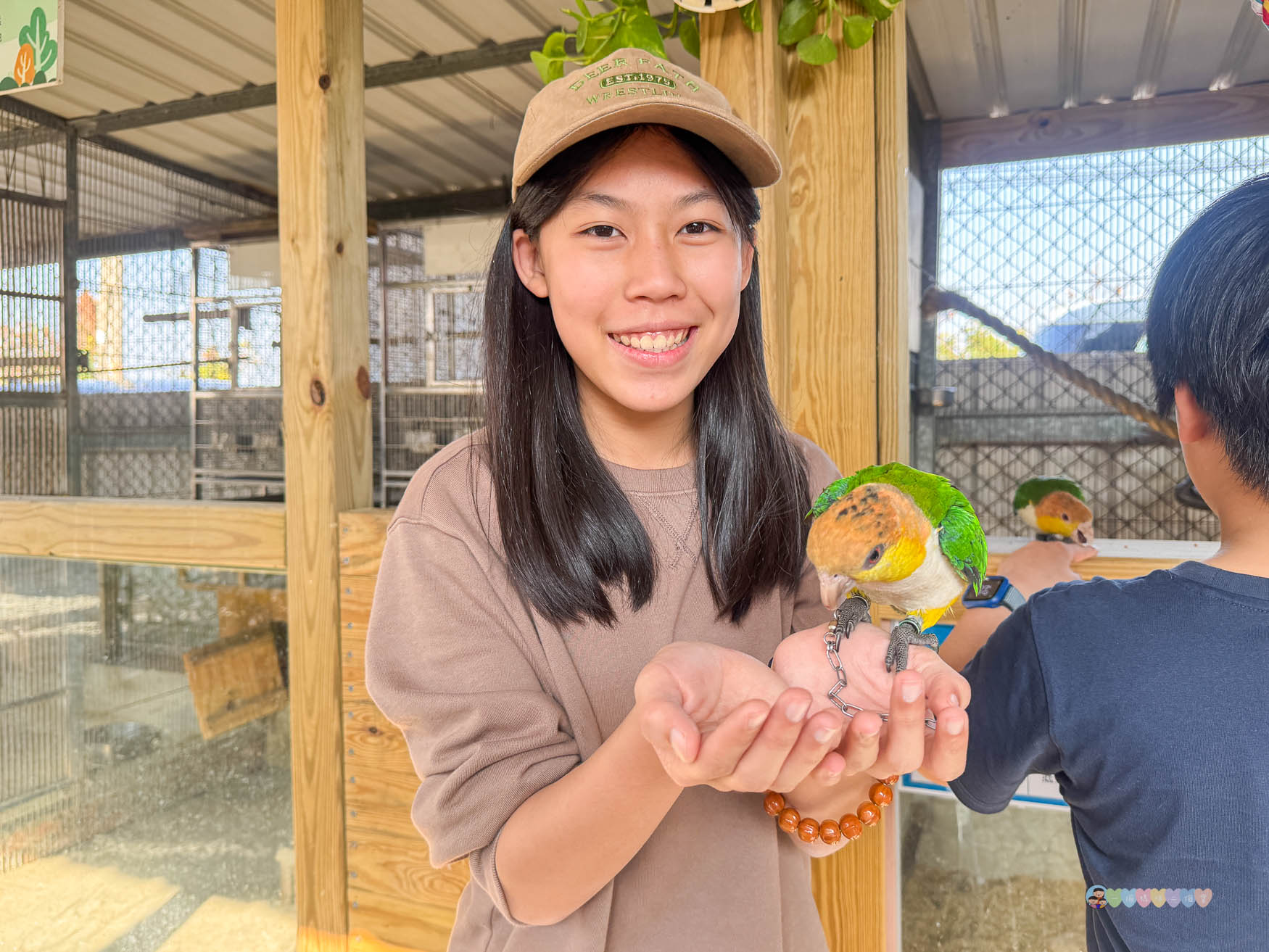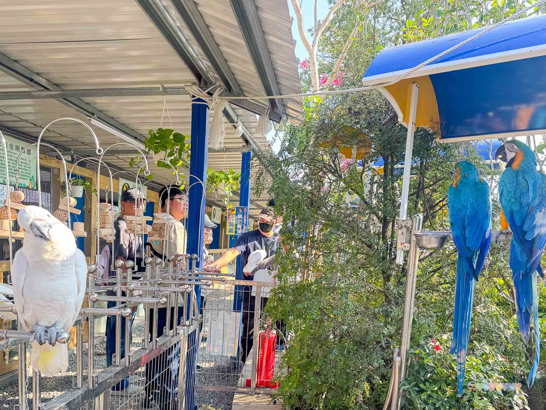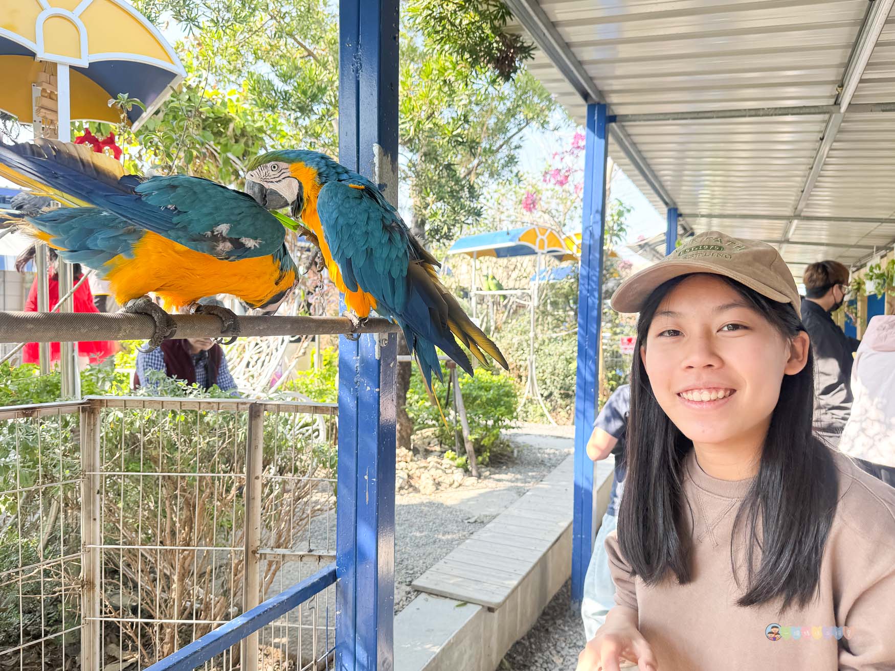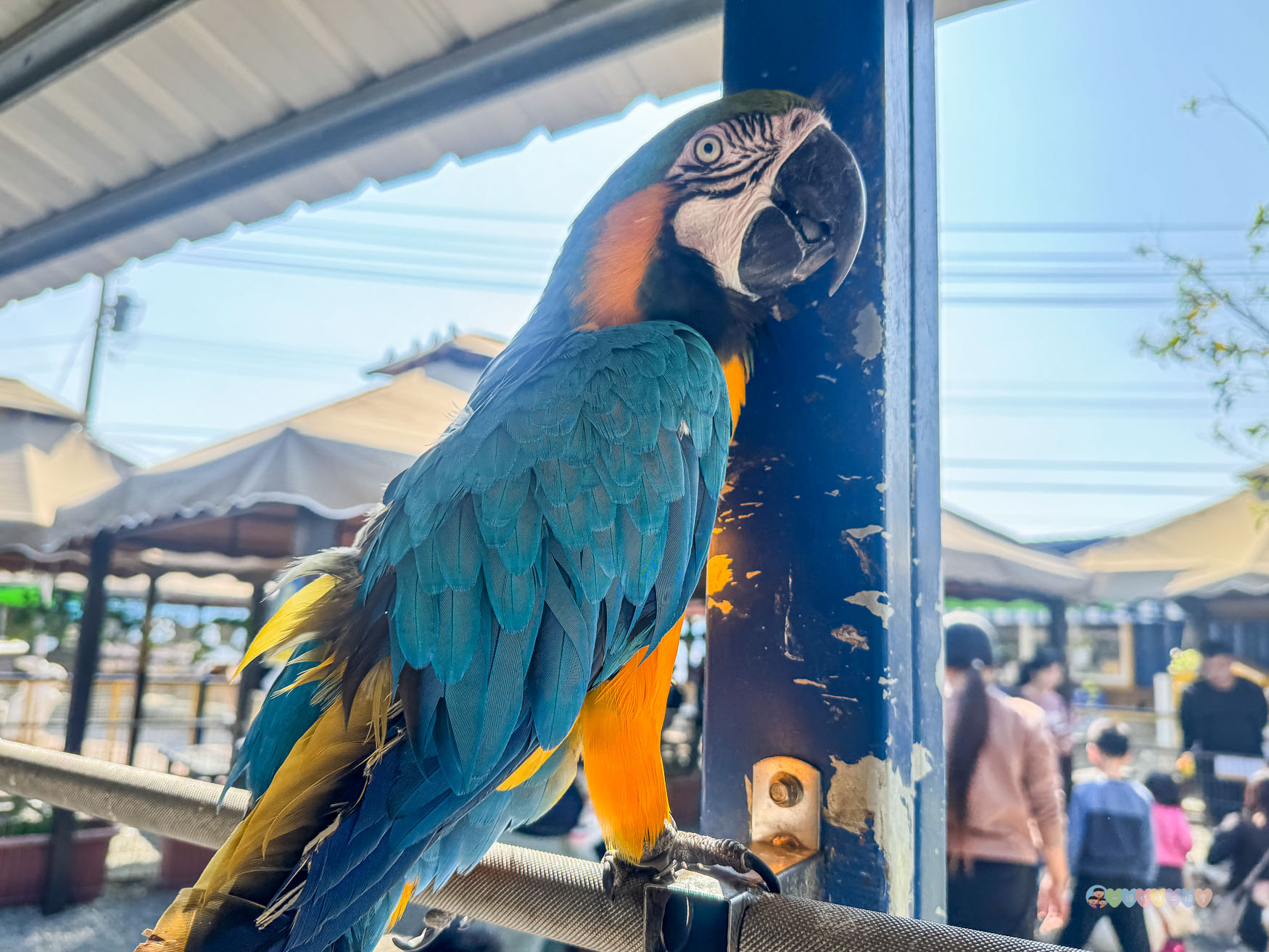 一路繞到鸚鵡區,這群小可愛根本是會飛的狗狗。五顏六色的羽毛在陽光下閃閃發亮,牠們一邊喳喳叫、一邊用那招牌「歪頭殺」觀察著我們,眼神裡全是好奇又有點傲嬌的神情。
