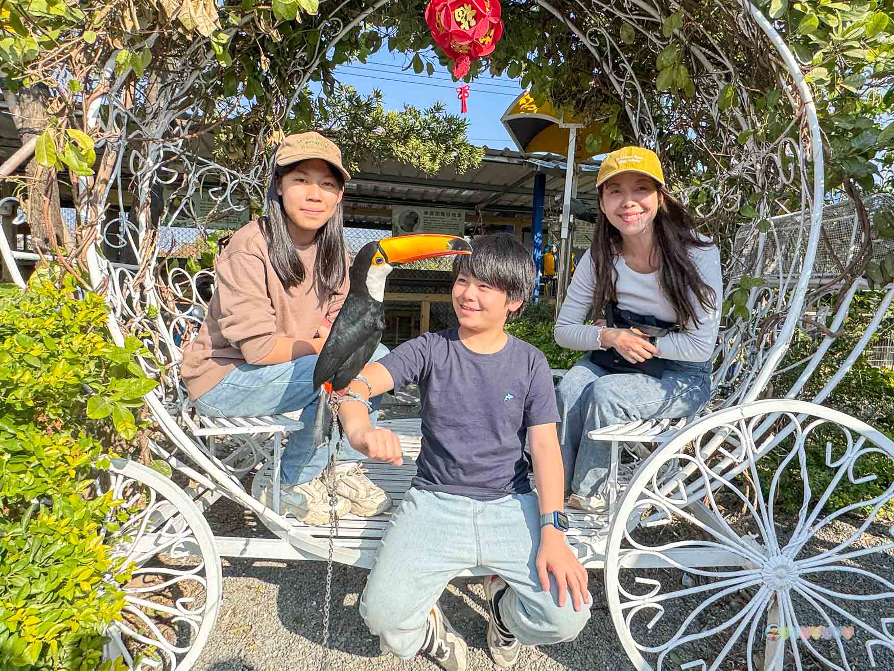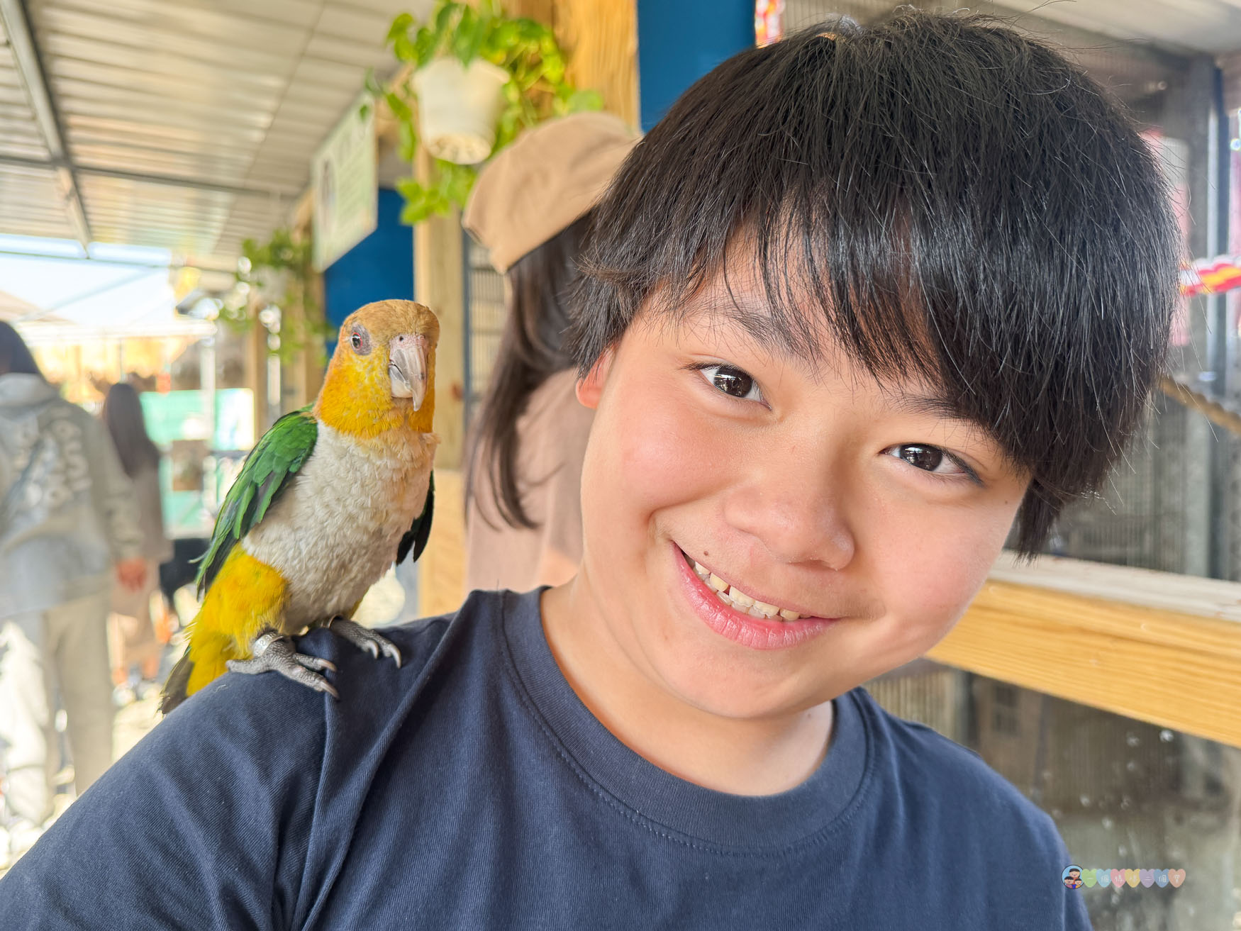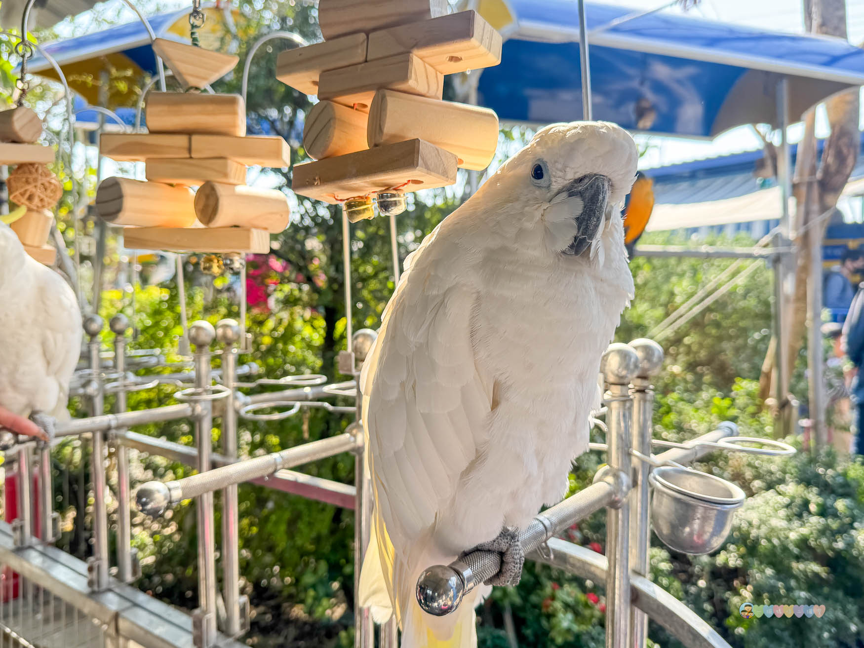 一路繞到鸚鵡區,這群小可愛根本是會飛的狗狗。五顏六色的羽毛在陽光下閃閃發亮,牠們一邊喳喳叫、一邊用那招牌「歪頭殺」觀察著我們,眼神裡全是好奇又有點傲嬌的神情。