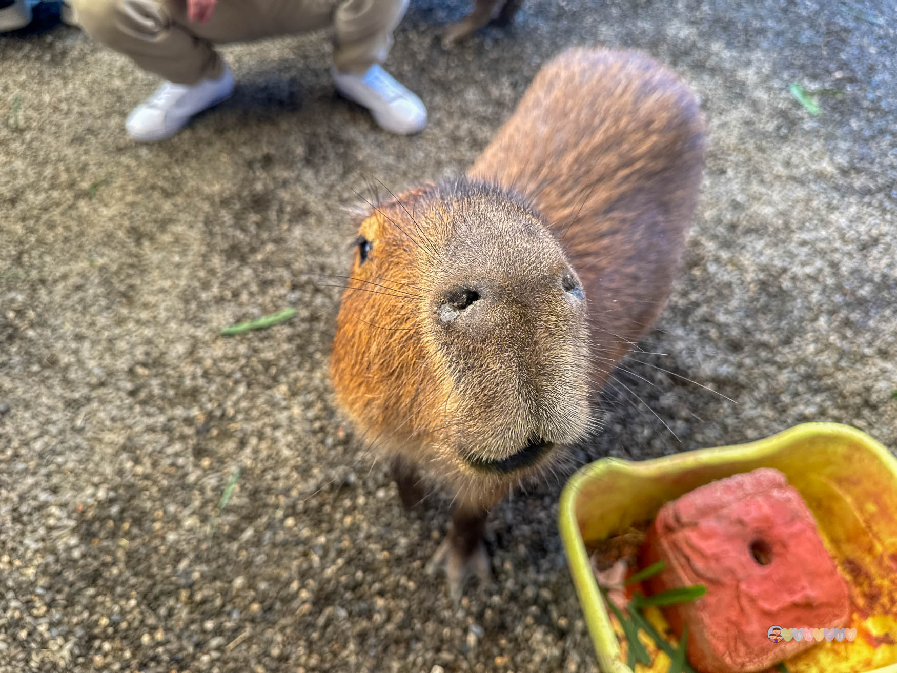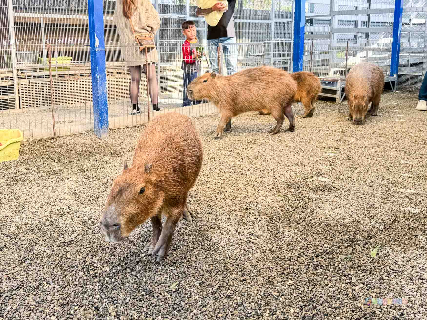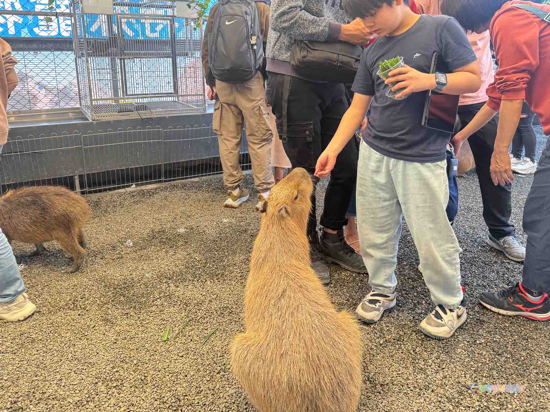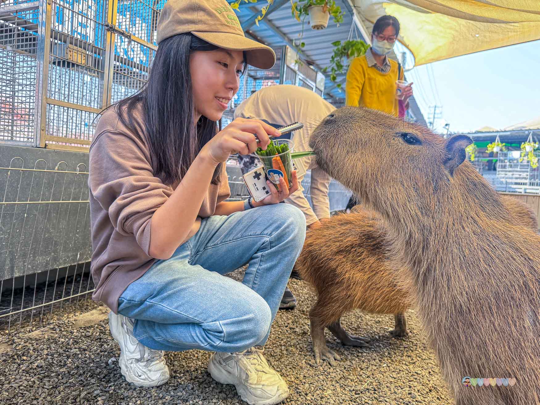 原本只是抱著「讓孩子看看小動物」的心情而來,沒想到「嘎逼&牛奶寵物互動園區」裡的動物種類這麼豐富:從溫馴的水豚、呆萌的狐獴、療癒的貓咪、活潑的鸚鵡、甚至連氣勢十足的栗翅鷹、特色滿滿的無毛豚鼠都有登場!零距離的互動體驗,也算是讓我們大開眼界。