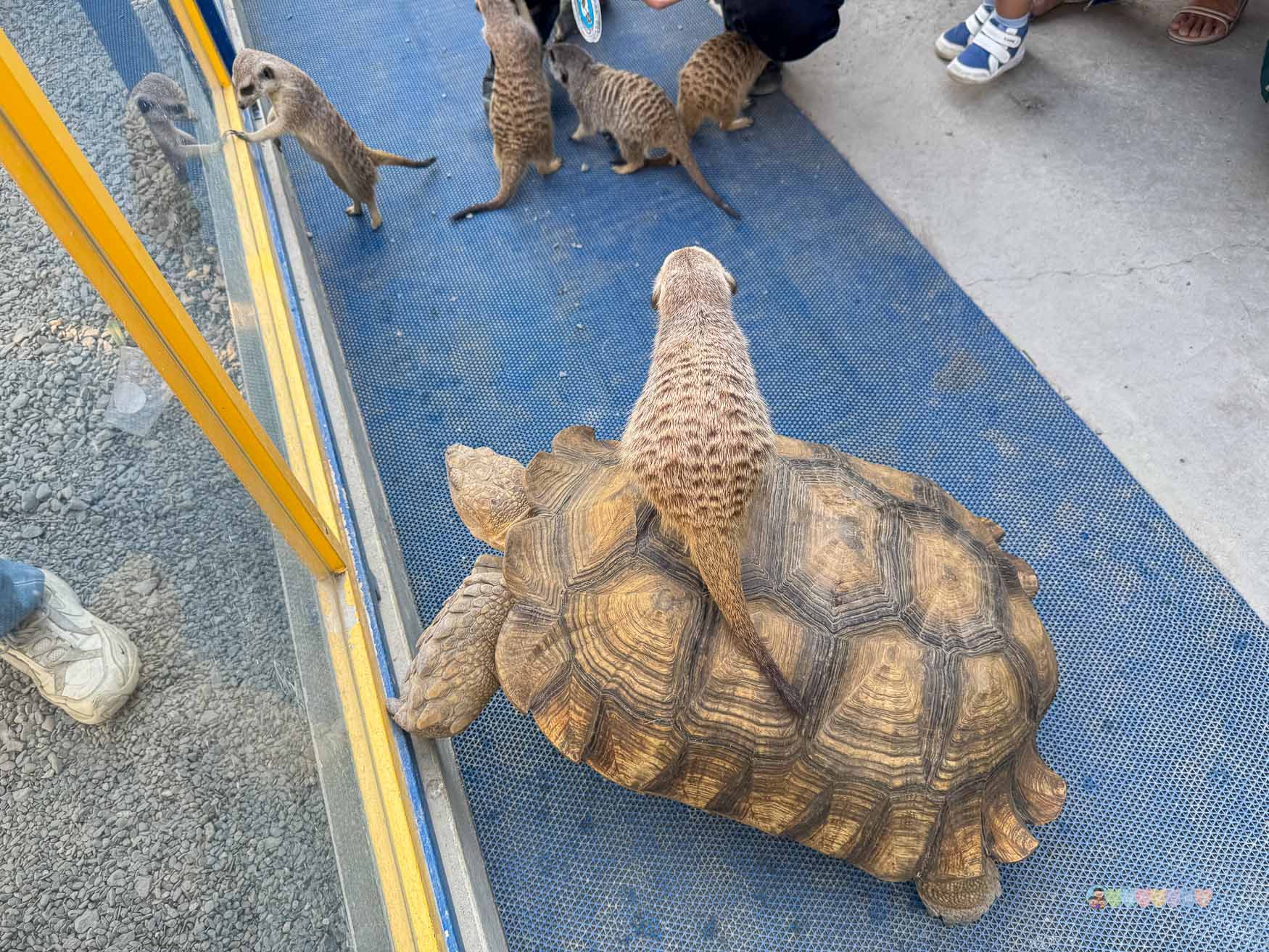 狐獴區竟然也能看到蘇卡達象龜,很好笑的是這些調皮的狐獴還會搭乘烏龜車,悠哉散步。