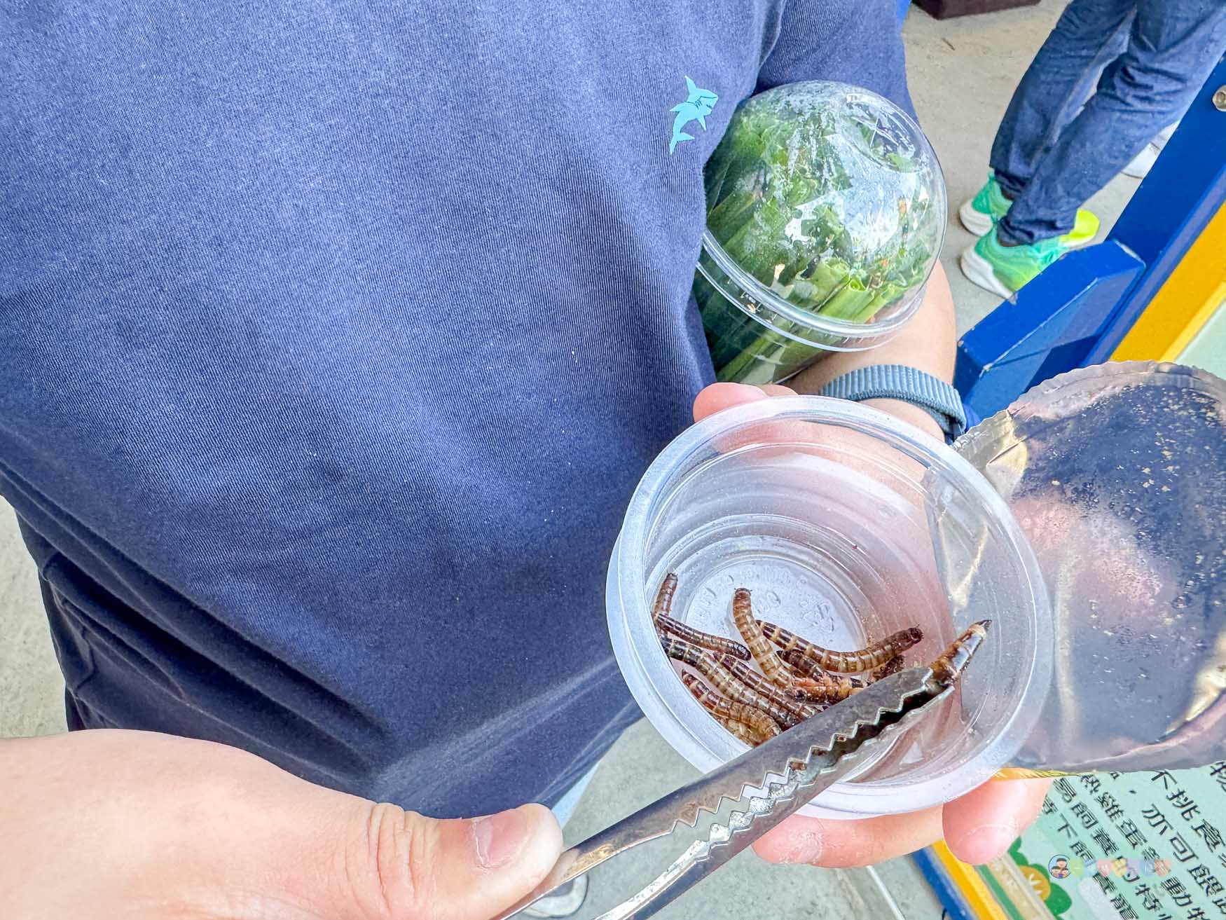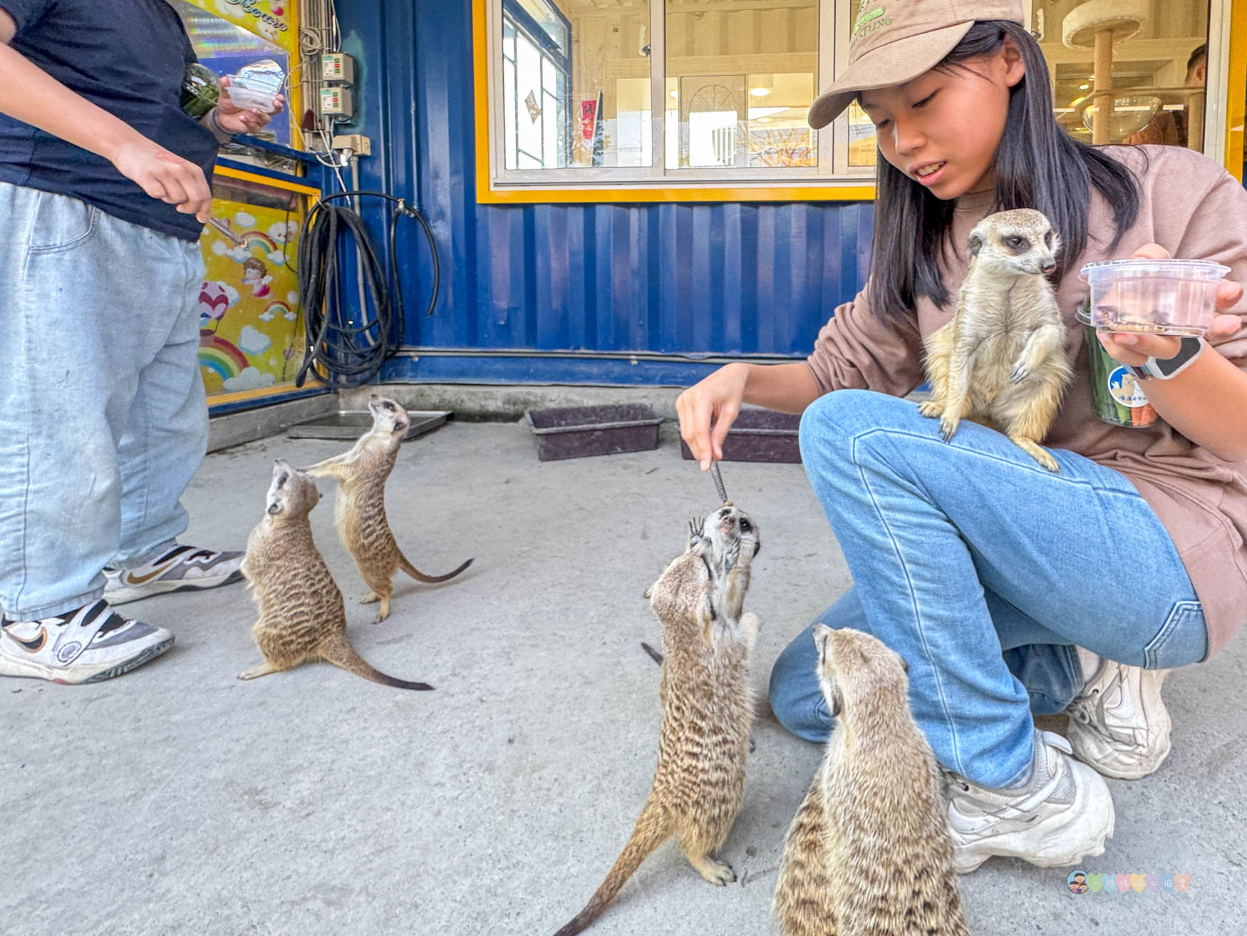 不誇張!一進入成群的狐獴就湊過來,為的就是手上那整碗的「大麥蟲」,如果會怕蟲的不用擔心,都會提供夾子餵食。