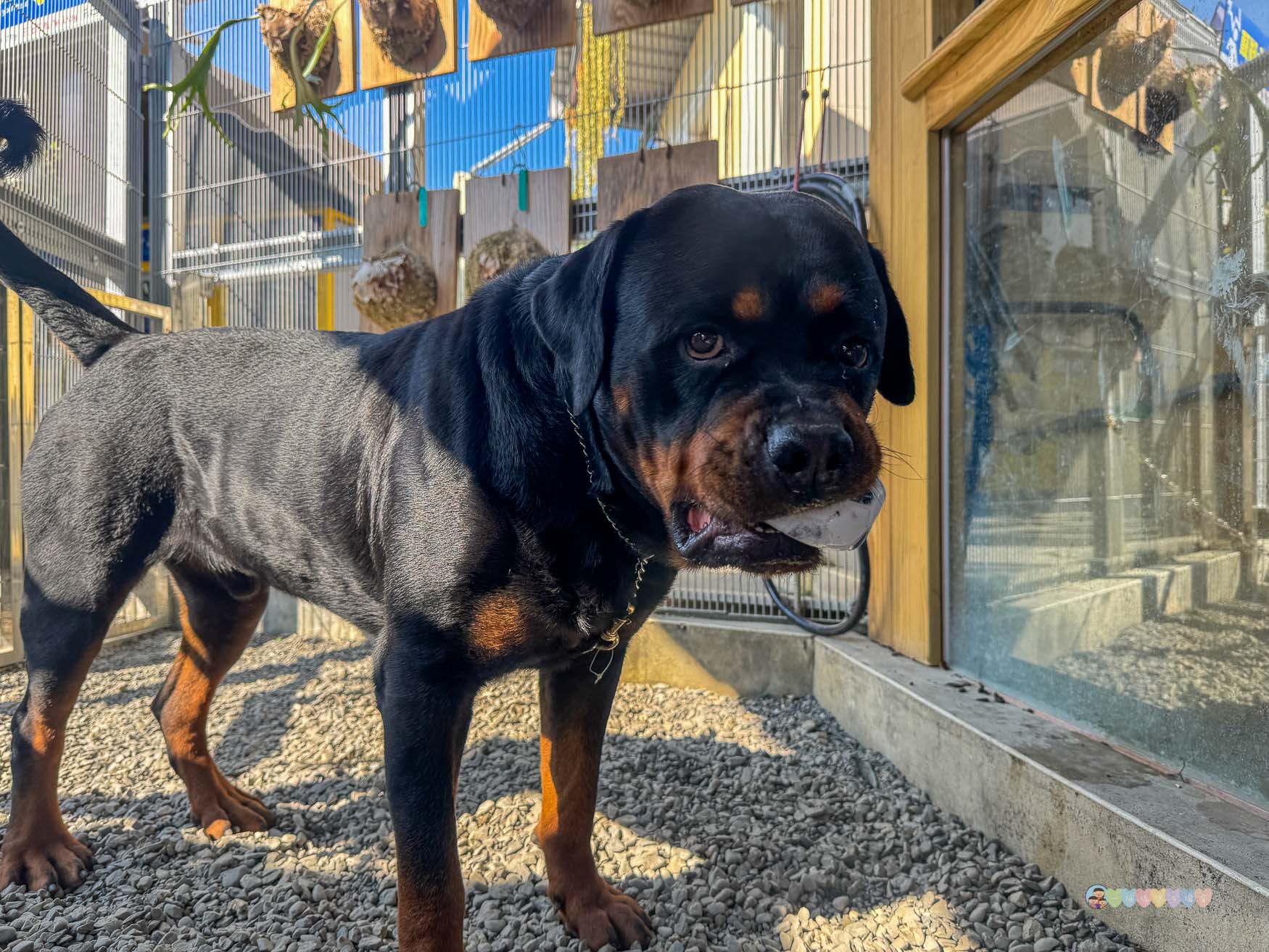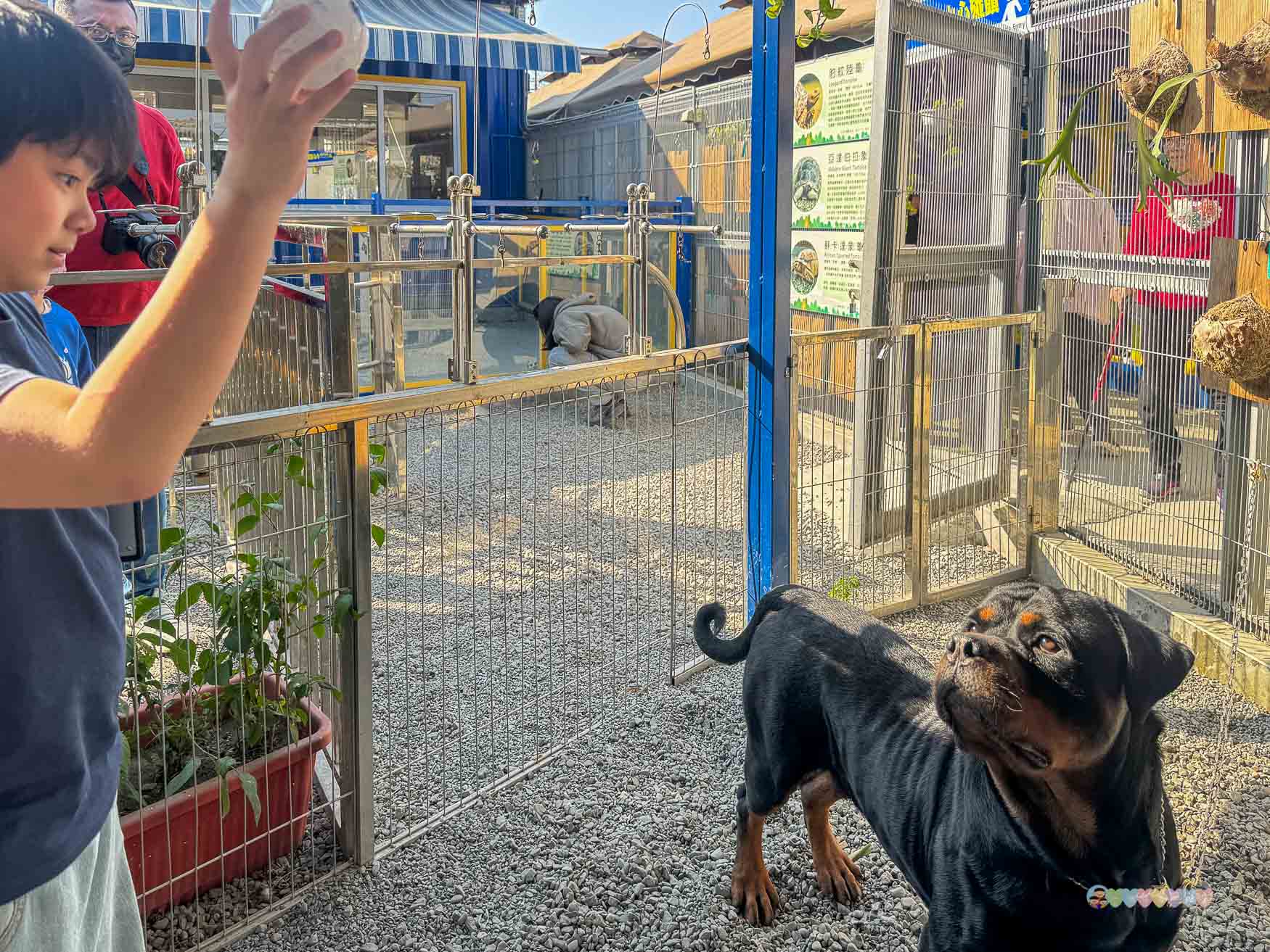 另外在狗狗區外頭也有一隻大型犬「羅威那」,別看他長相凶狠其實個性超級呆萌,還會推球過去請你丟。