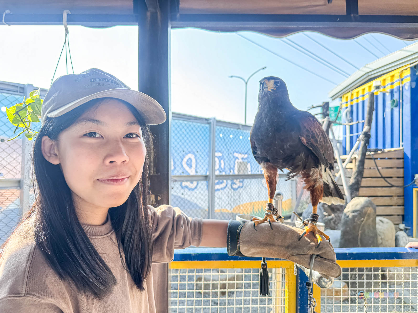 「嘎逼&牛奶寵物互動園區」裏頭的動物幾乎都是可以零距離接觸,沒想到連「栗翅鷹」都有上手的體驗。工作人員會指導如何伸出手臂保持平衡,那畫面真的太值得留念了。