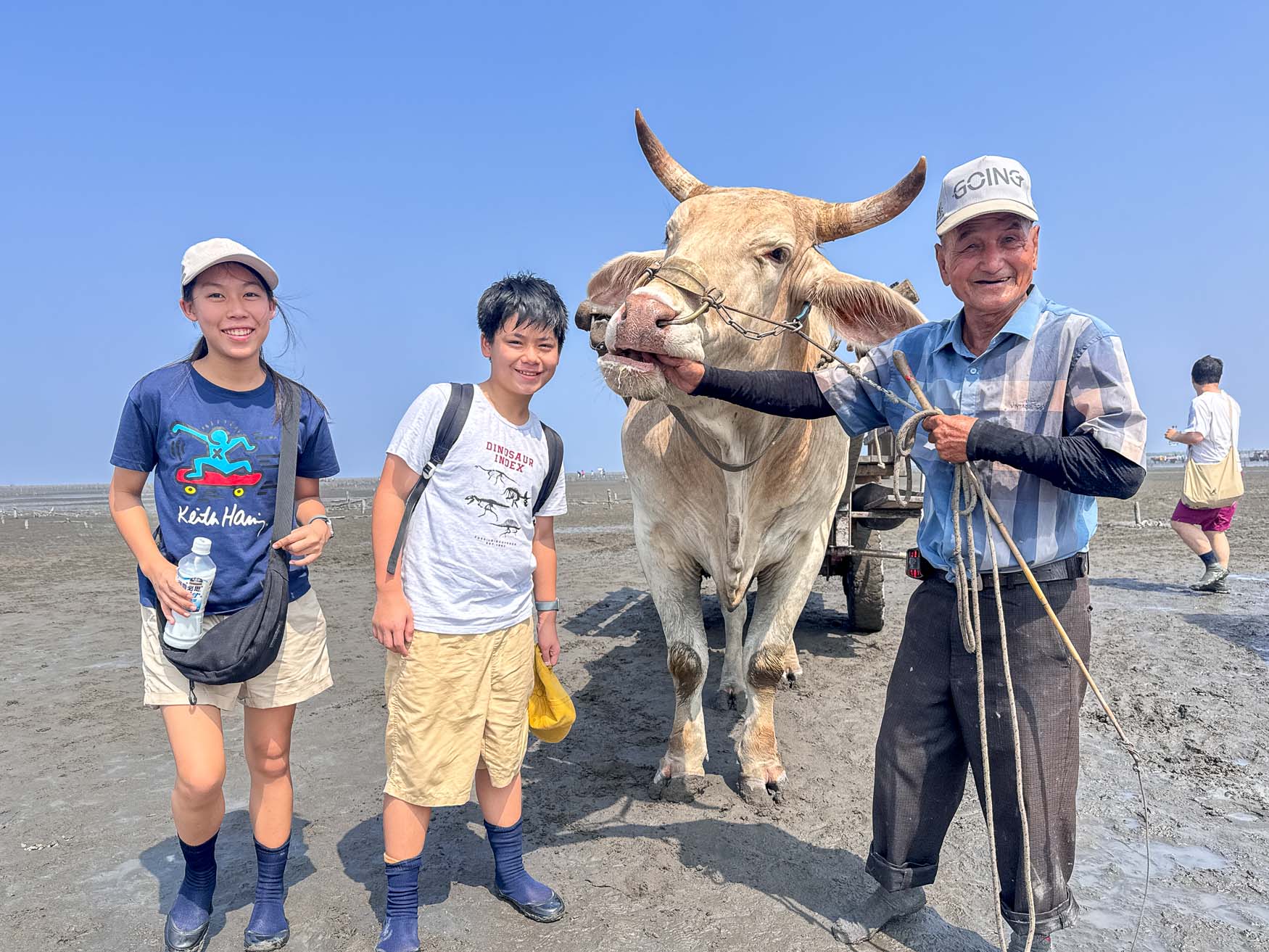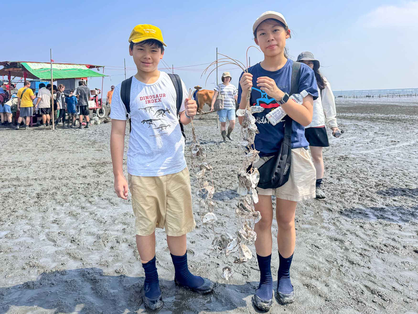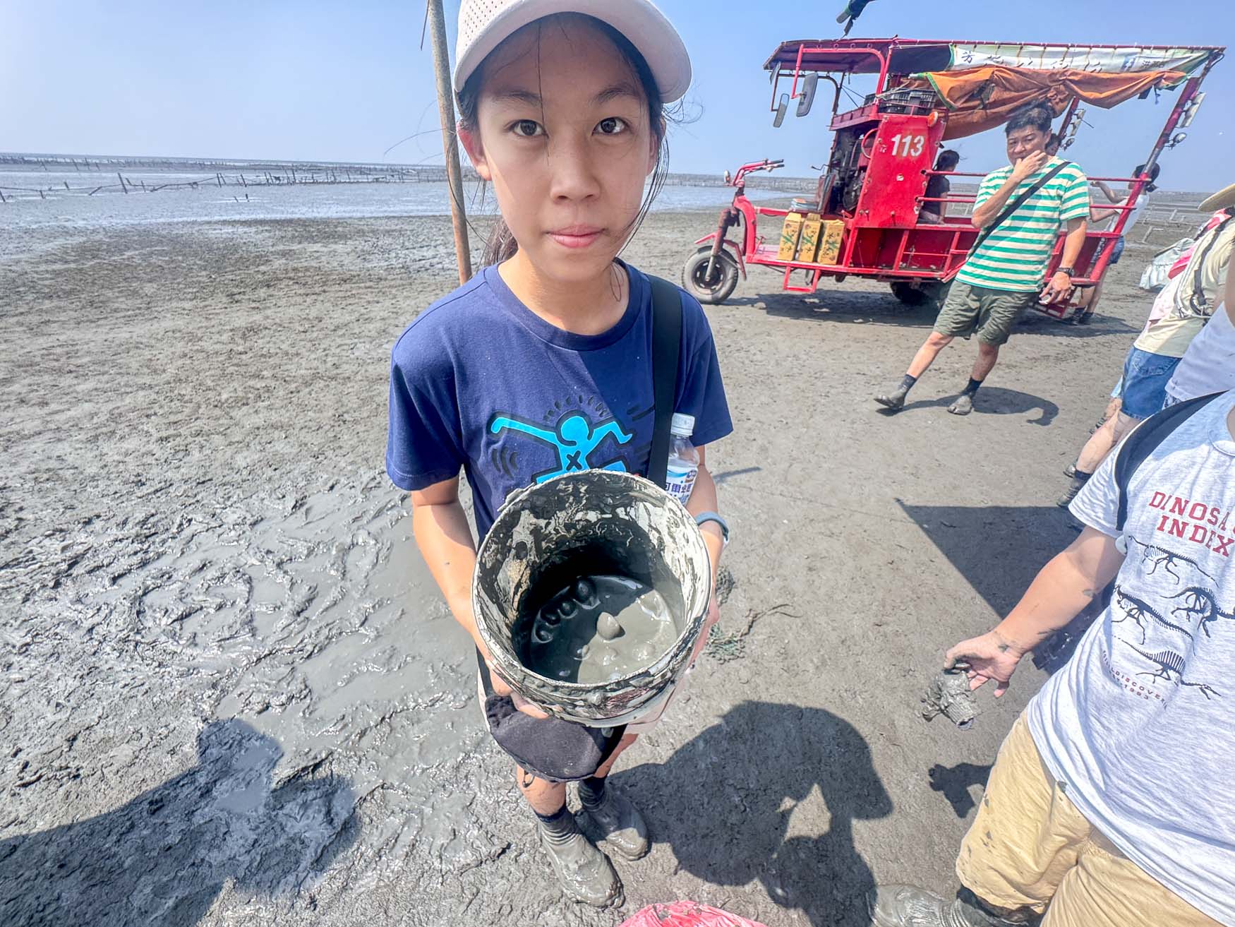 芳苑濕地以生態豐富、海牛車文化獨特聞名,這裡不僅有滿滿的漁村風情,還能帶小朋友一起坐上海牛車、體驗挖蛤仔、享受現烤蚵的鮮美滋味,Google搜尋就有不少專門帶入濕地的體驗活動,我們這次請「芳苑海牛車伯」為我們服務,活動時間大概是2.5-3個小時,也有導覽帶著我們認識溼地的生態。這一趟下來光是伸手挖蛤仔,一趟彰化半日遊就讓孩子們玩得盡興,建議要多帶一套衣服替換、還有先查好潮汐預報喔。↗上網查潮汐預報↗