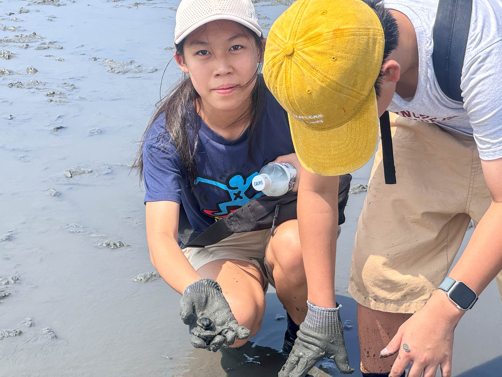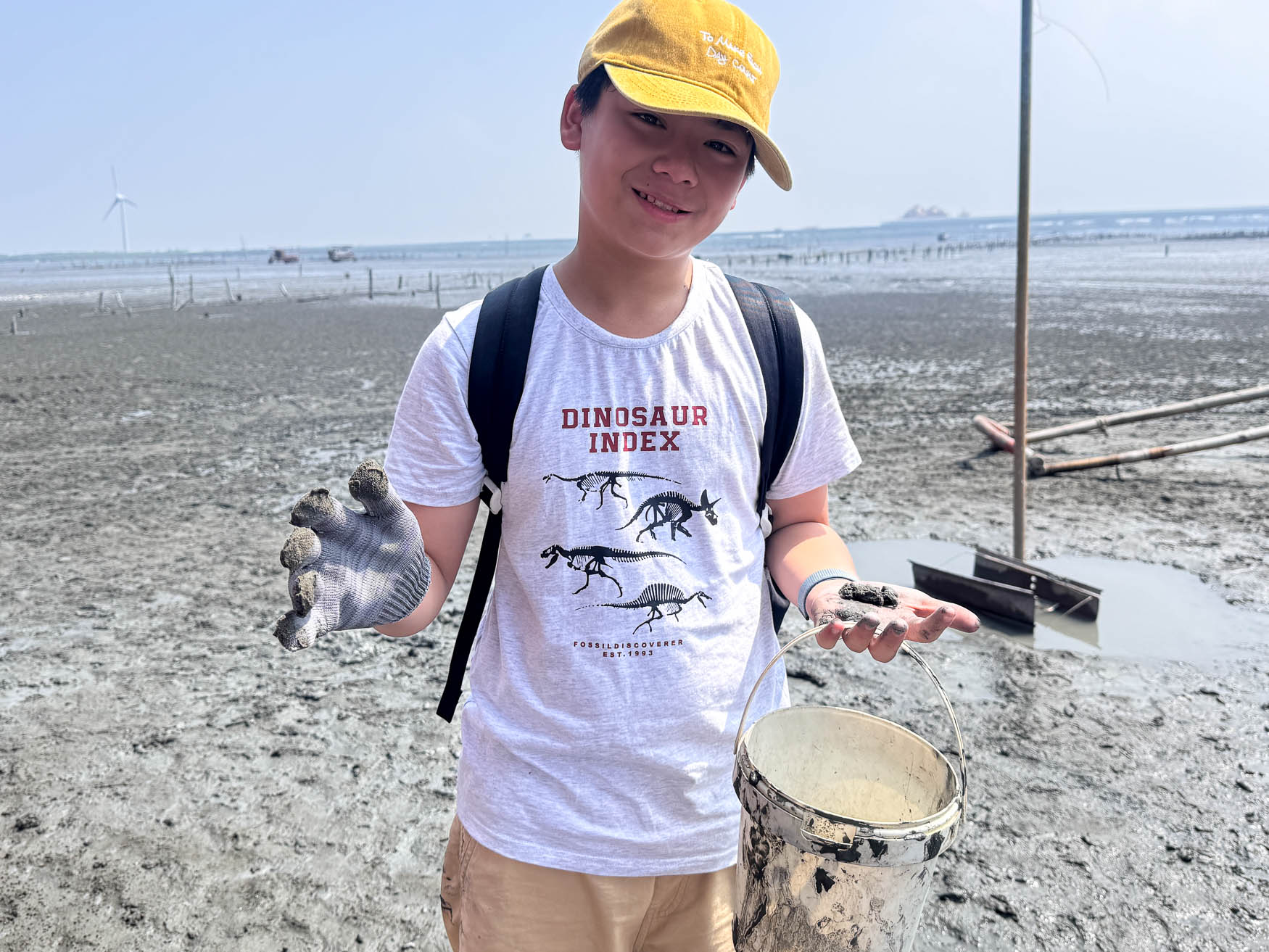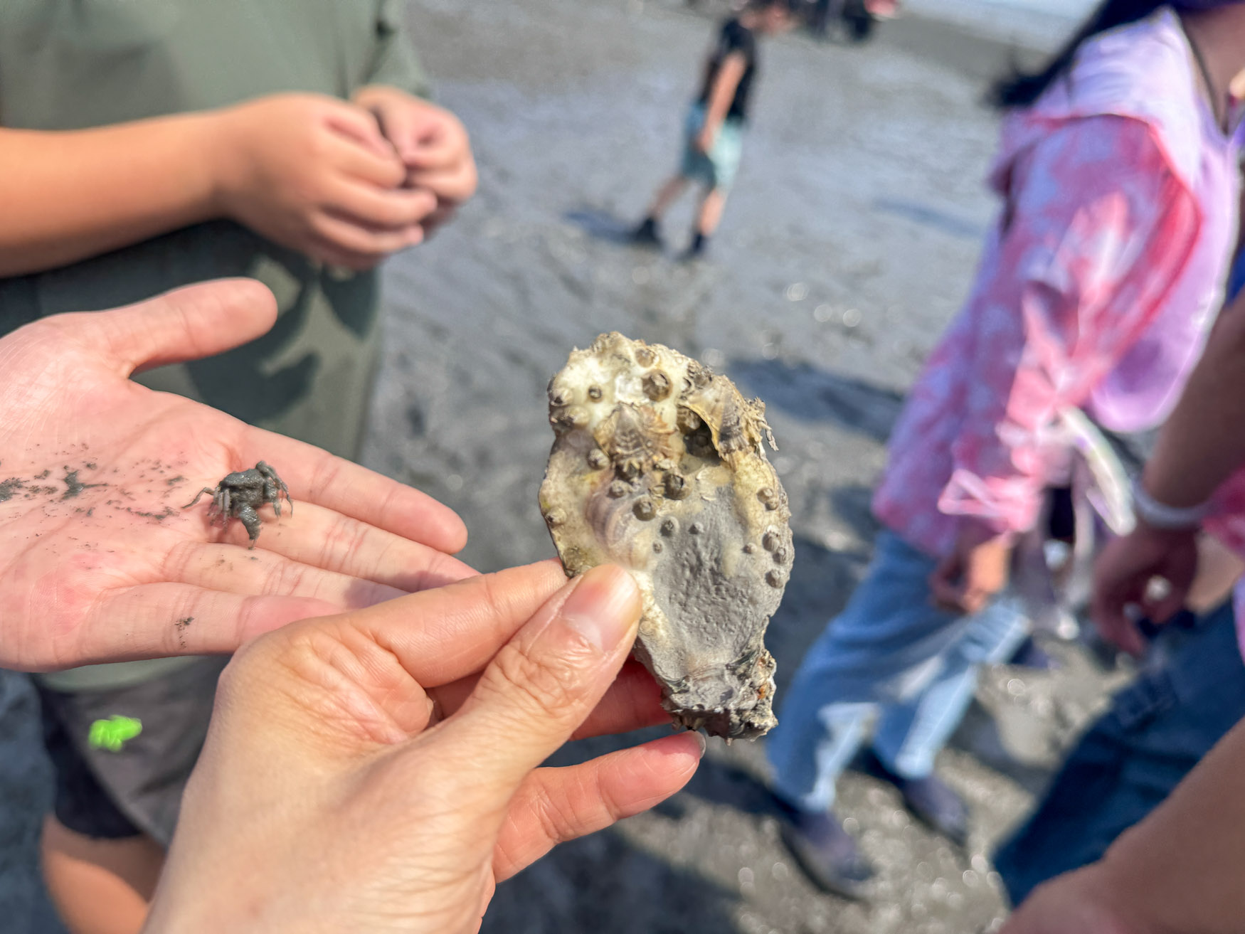 孩子們除了在潮間帶挖蛤仔,還發現了好多小螃蟹。牠們一看到人靠近,就左右橫著走,快速鑽進小洞裡,小孩忍不住跟著追逐。