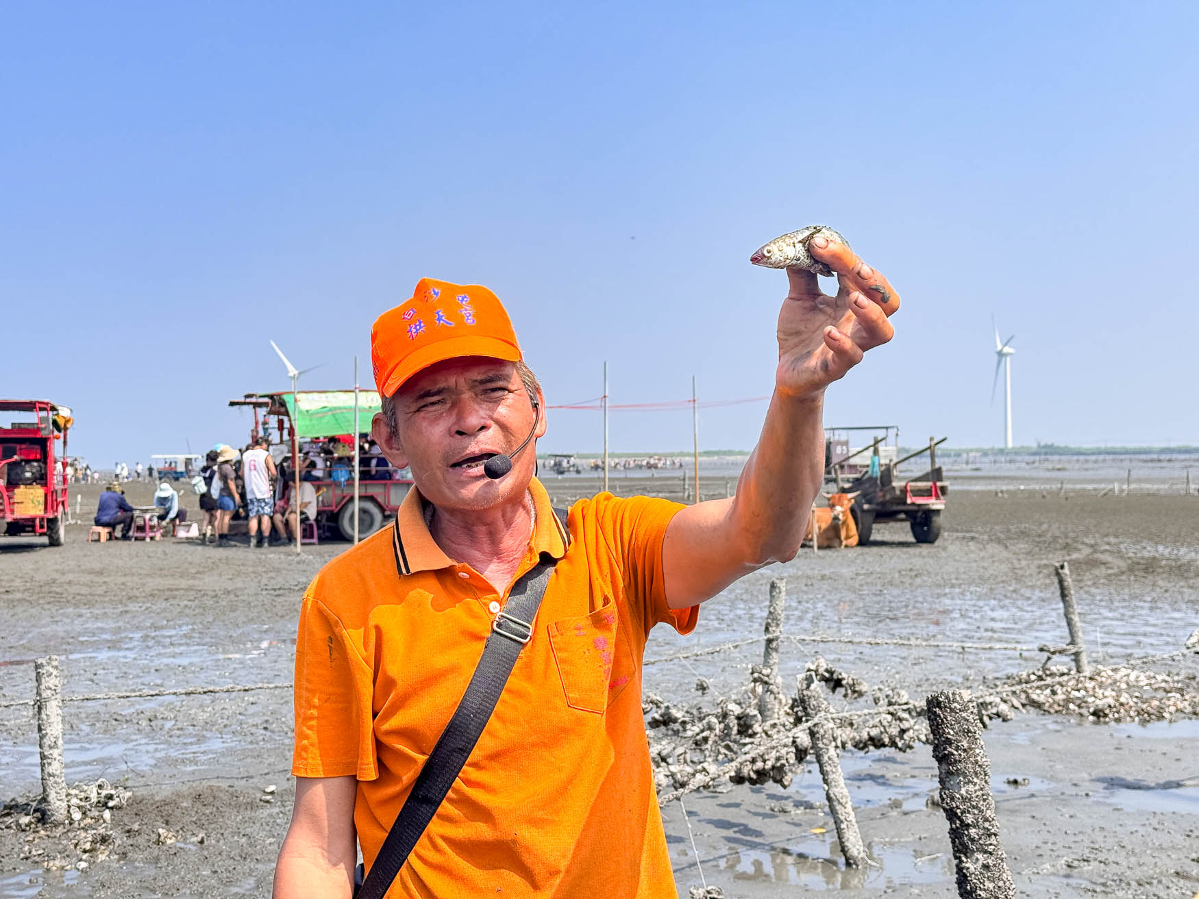 只見養蚵大哥從網內拿出活跳跳的烏魚,讓大家知道溼地不只養蚵仔,也蘊含豐富的漁獲。