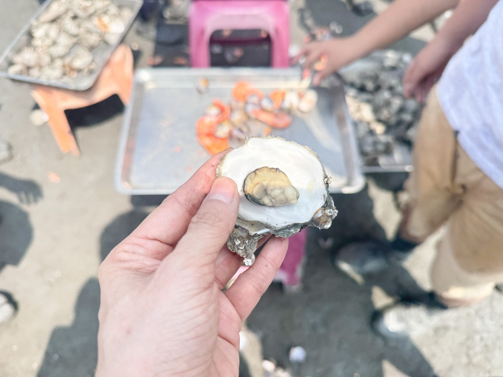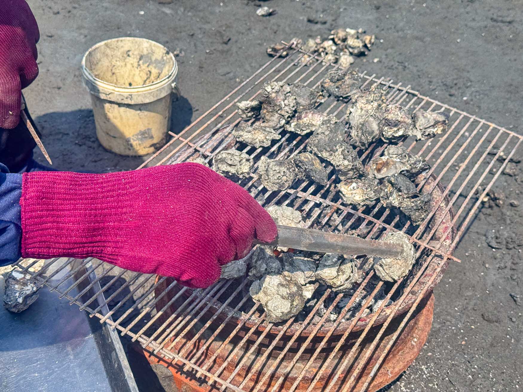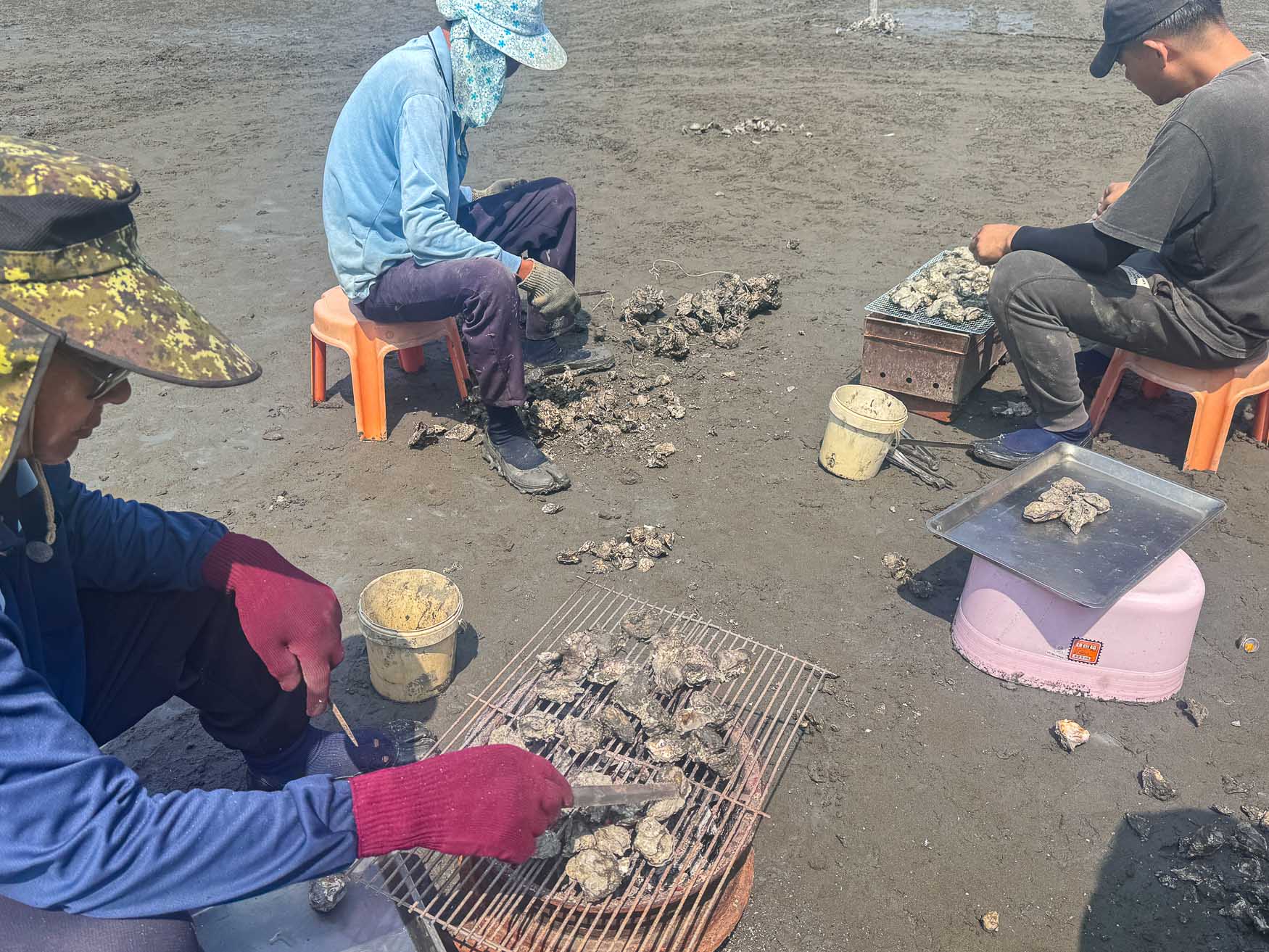 蚵殼還帶著海水的鹹香。工作人員只要把蚵仔往火爐上一丟,沒多久熱騰騰的蚵仔簡直是大海最鮮甜的味道。