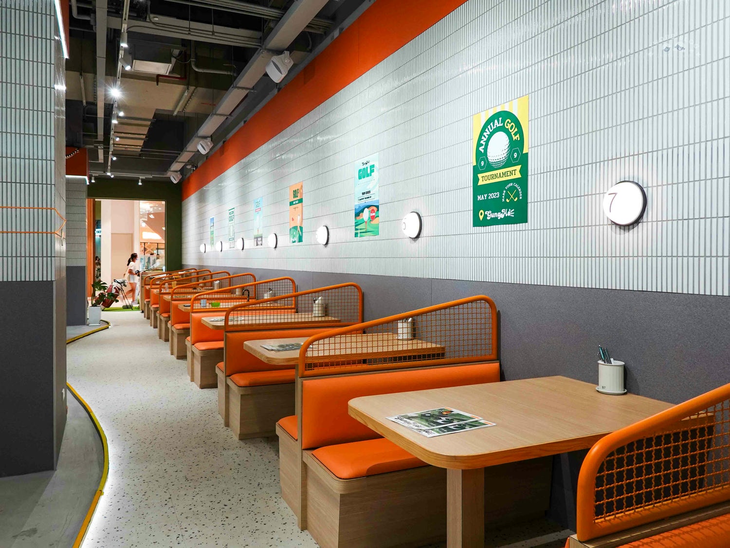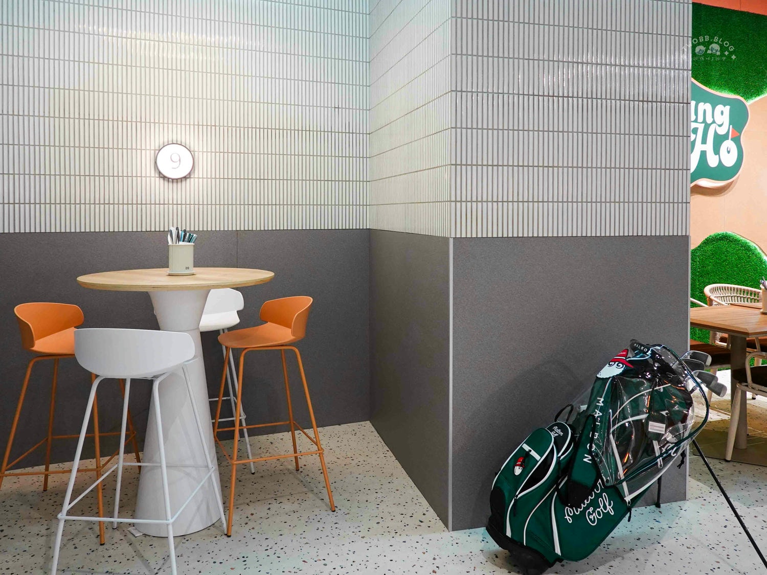 以高爾夫為主題所到之處看到都是高爾夫相關擺設,餐廳內座位分布從吧檯、雙人到多人位置都有,適合家庭組團一起來歡聚。店內整體來說相當寬敞,小朋友盡情推桿,家長們可以開心相聚聊天。