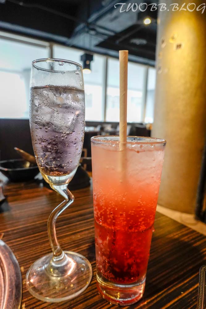 「紫色星空」以黑醋栗為主要口味,搭配其他果漿類的調製的氣泡水,特別在吃了燒烤喝上幾口,非常清爽。「草莓沙哇」喝起來多了一些甜甜的口感,是一種喝了會感到幸福的氣泡水口味。