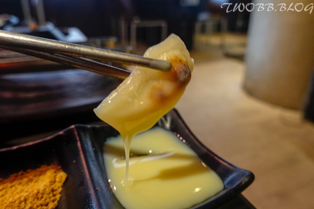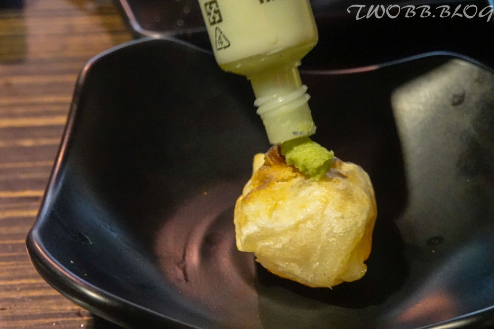 「麻糬章魚燒」服務人員說這道是中壢店特有的私房菜,不在菜單裡頭,而且別家分店的地方吃不到喔,將二片麻糬包上透抽,塑形成圓形狀,看起來已經有章魚燒的雛型囉。