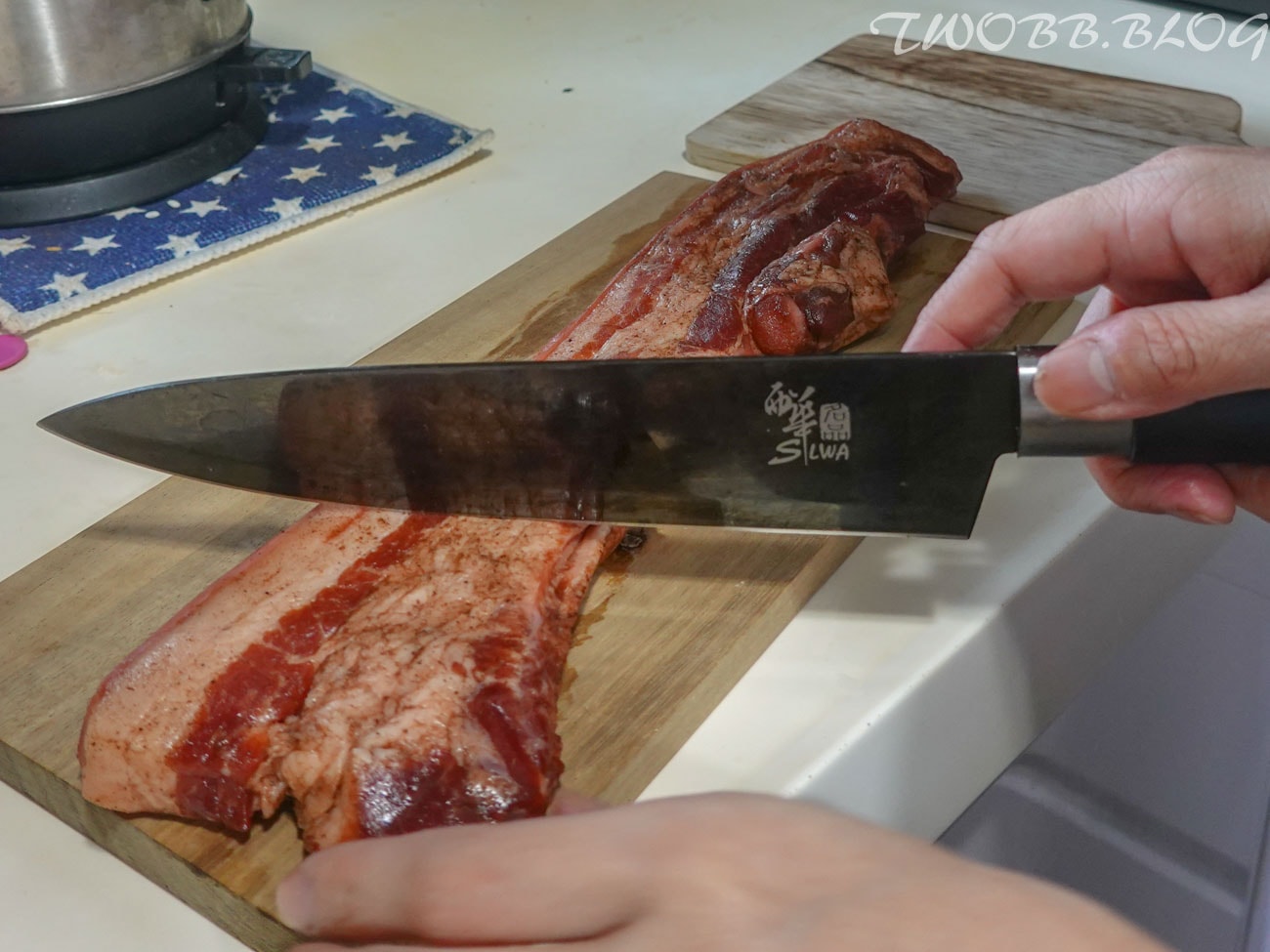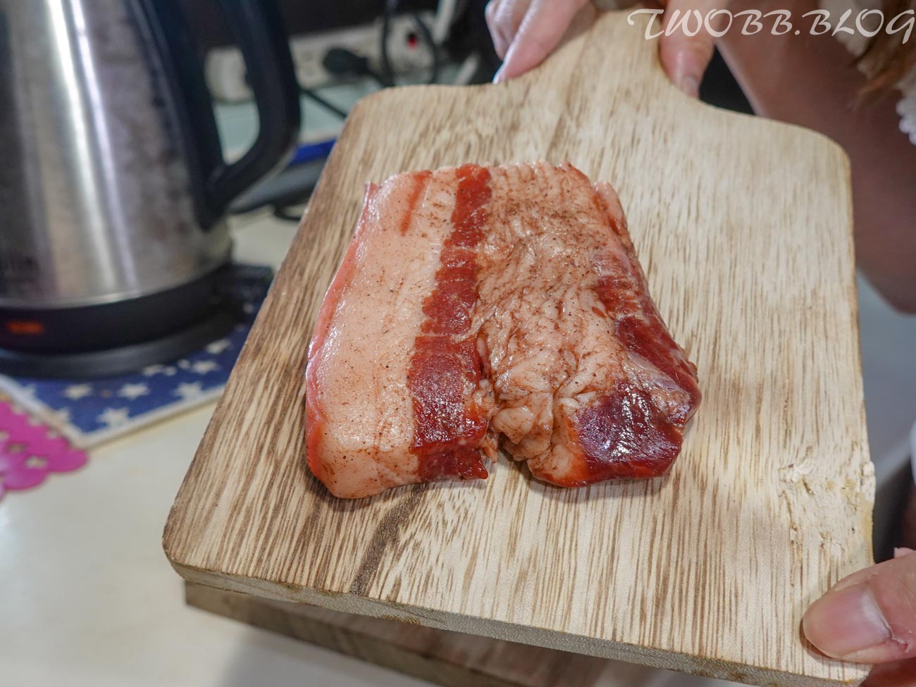 使用台灣溫體豬三層肉製成,一開封五香風味就撲鼻而來,他們的臘肉口味與一般市售的也比較不同,賜生的臘肉五香味道比較重,口味比較甘甜一些,也沒有那麼的鹹,少了一點煙熏味,卻多了開胃的胡椒香氣及淡淡的酒香,切薄片搭配蒜片就很好吃,喜歡吃三層肉的朋友真的可以嘗試看看。