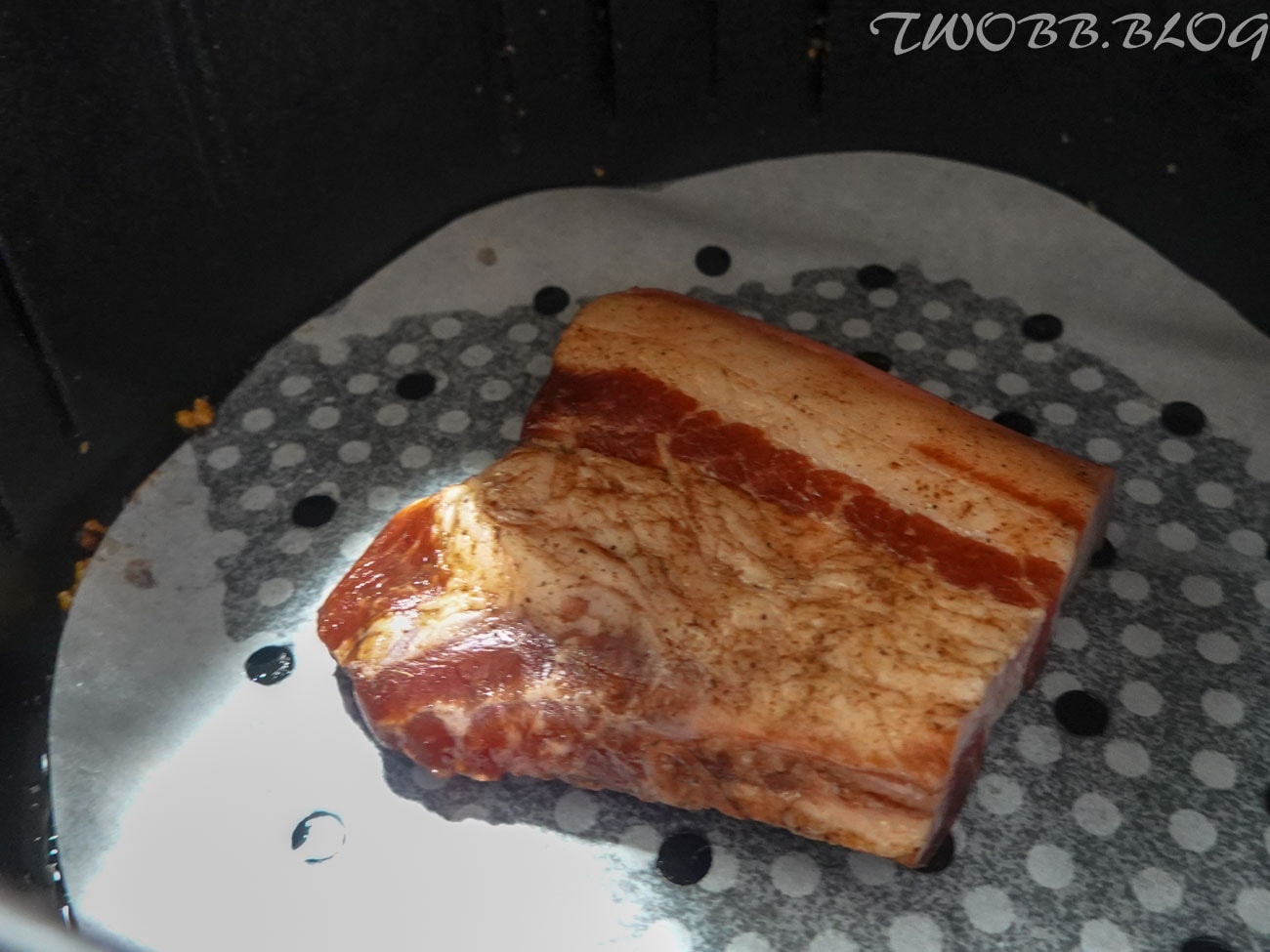 用烤箱或者氣炸鍋都可以,我個人偏愛使用氣炸鍋,不僅方便、受熱均勻,還能把三層肉多餘的油脂逼出,吃起來也比較不會那麼膩口。