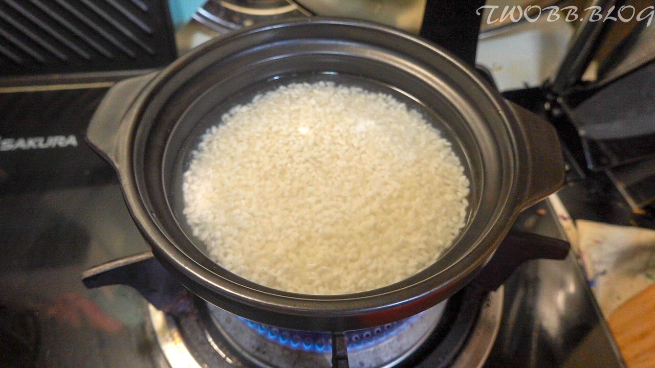 3.煸過臘肉的油倒入白米攪拌後蓋鍋蓋開小火(增加香氣用)