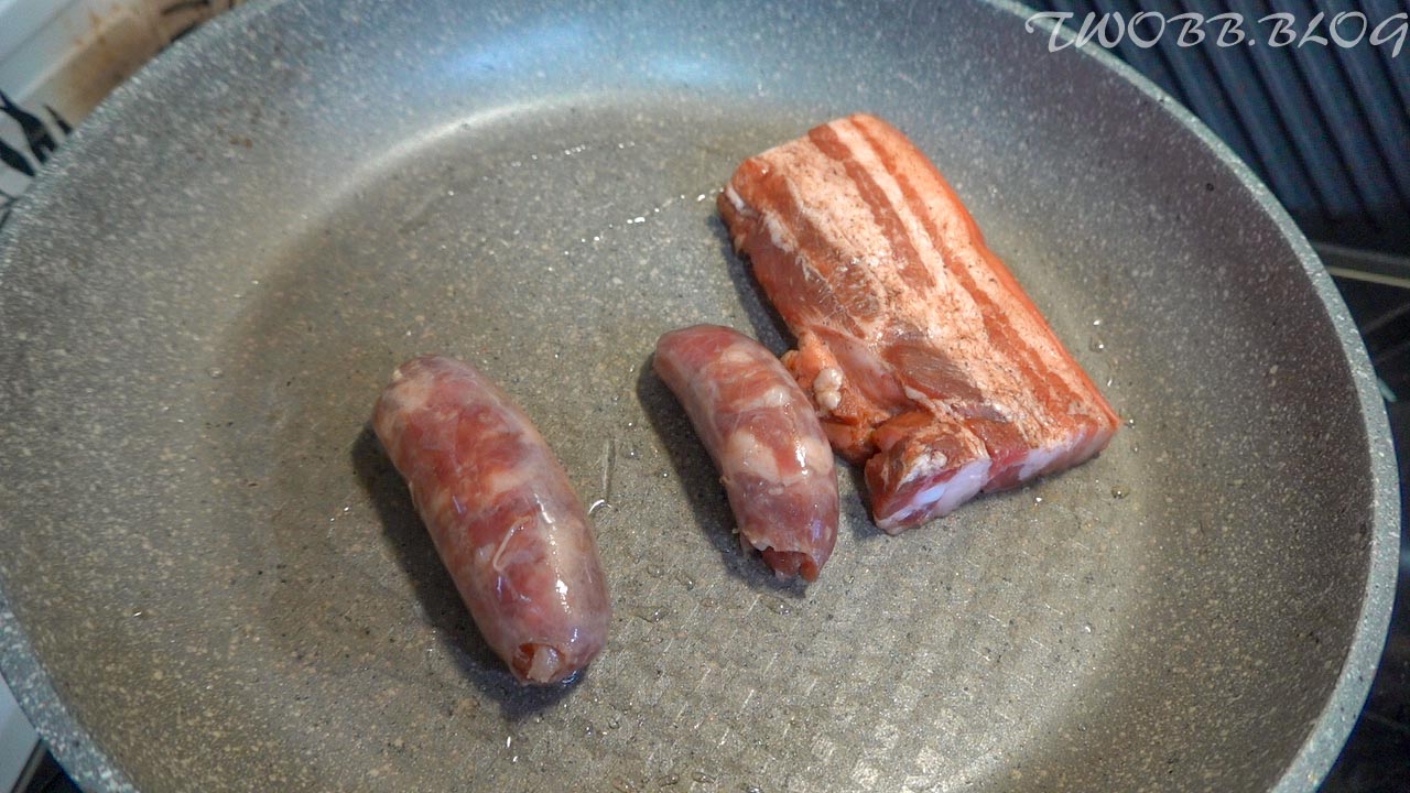 1.倒油熱鍋後放將臘肉及香腸稍微煸過起鍋備用