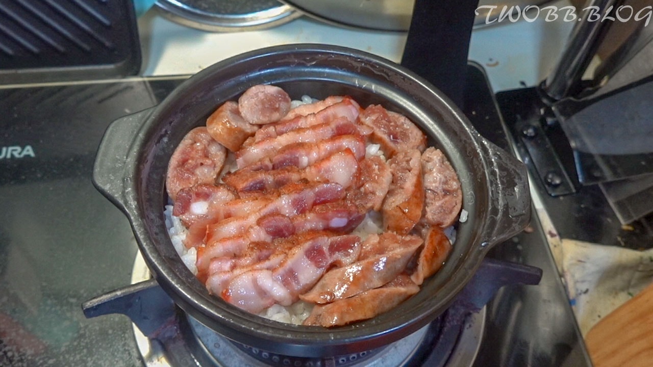 3.大約6分鐘後關火,開鍋蓋,擺入香腸及臘肉