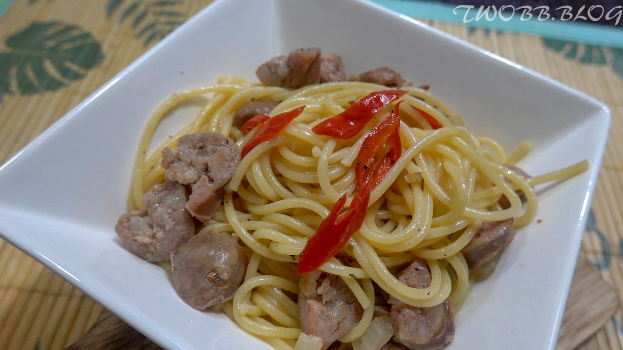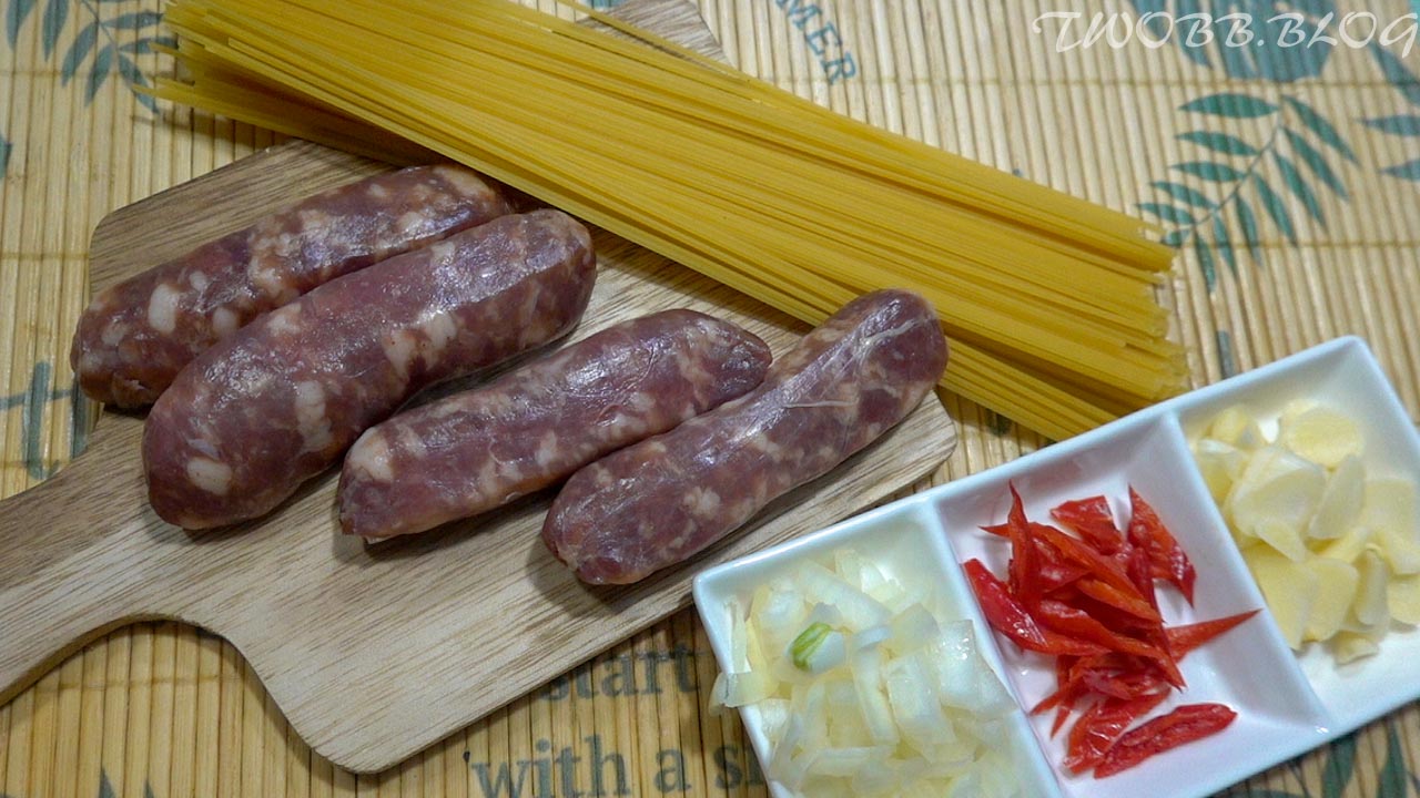 原味香腸「辣炒香腸義大利麵」》蒜香熱炒香腸夠味 微微辣小朋友也能接受