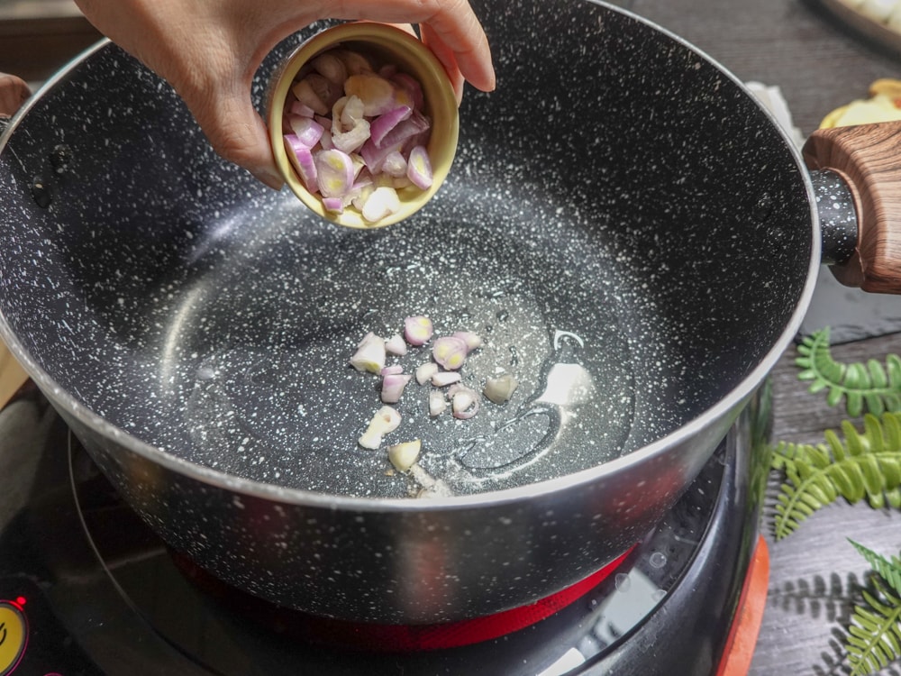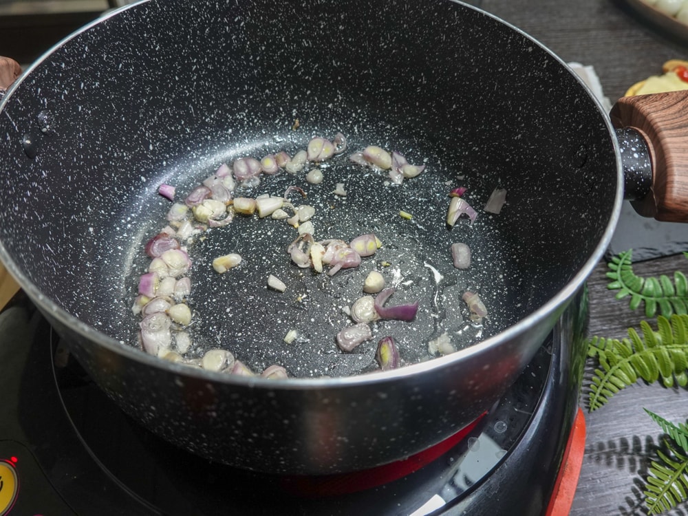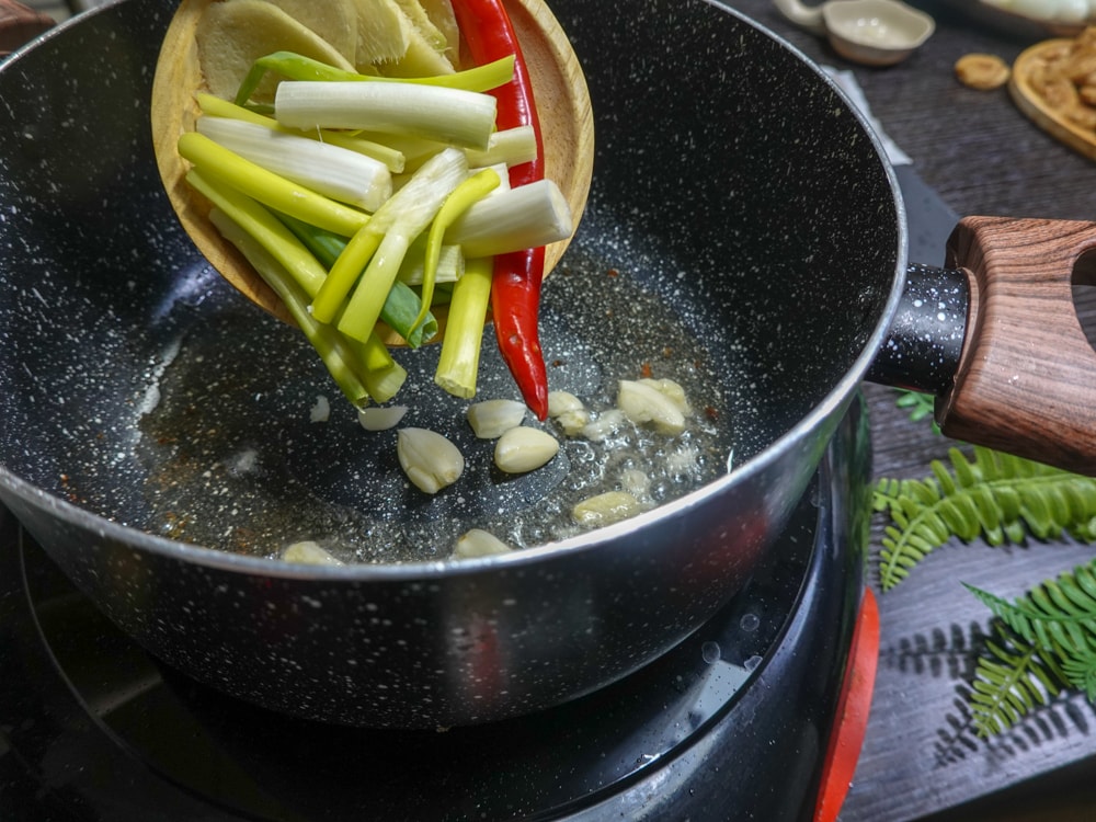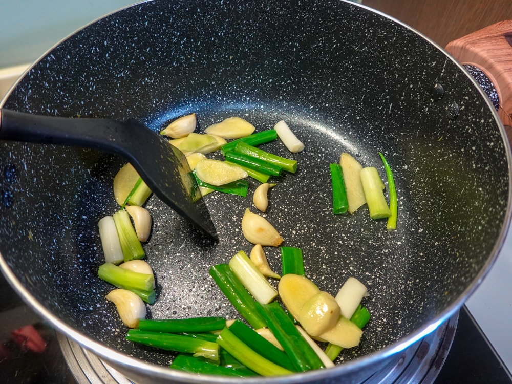 1.鍋中倒入沙拉油及蔥薑蒜爆香,炒至香氣冒出