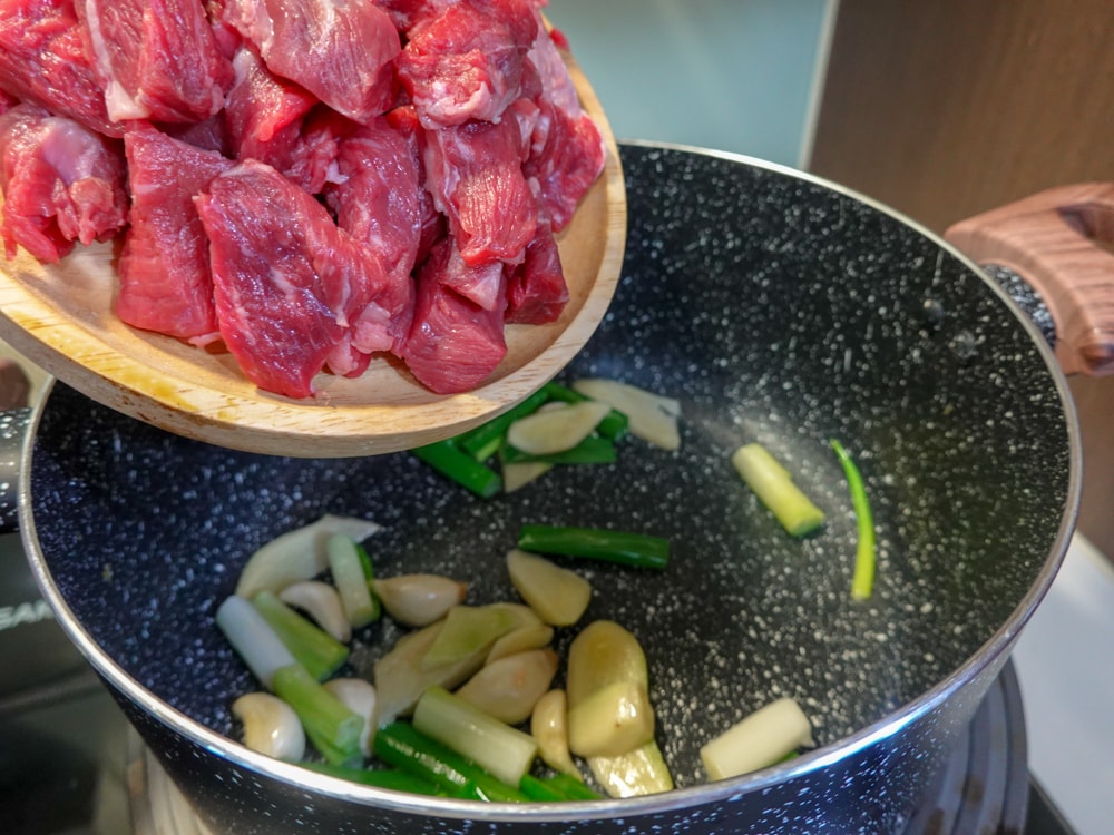 由於妮叡媽正在控制飲食當中,這次就不使用油脂豐富的牛腩肉作為主要食材,改以一般市售的大塊牛排肉切塊使用,一方面減少油脂攝取,份量也較適合我們一家三口。