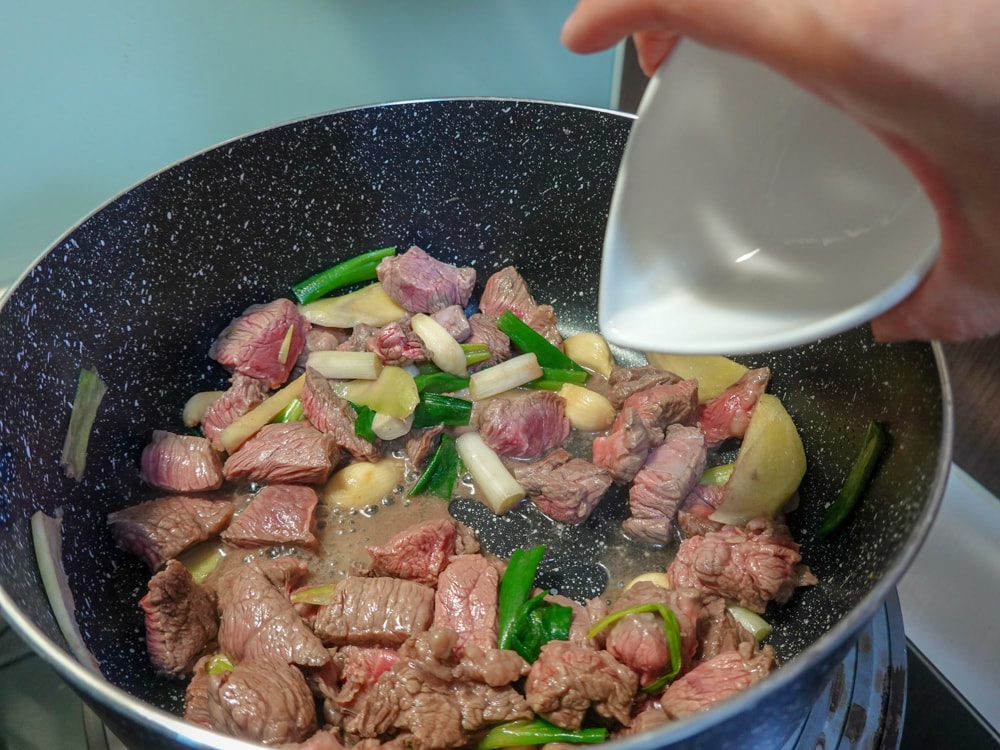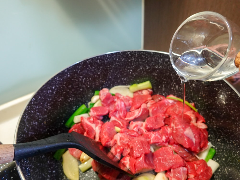 2.倒入牛肉後,再倒入米酒去腥,接著繼續拌炒