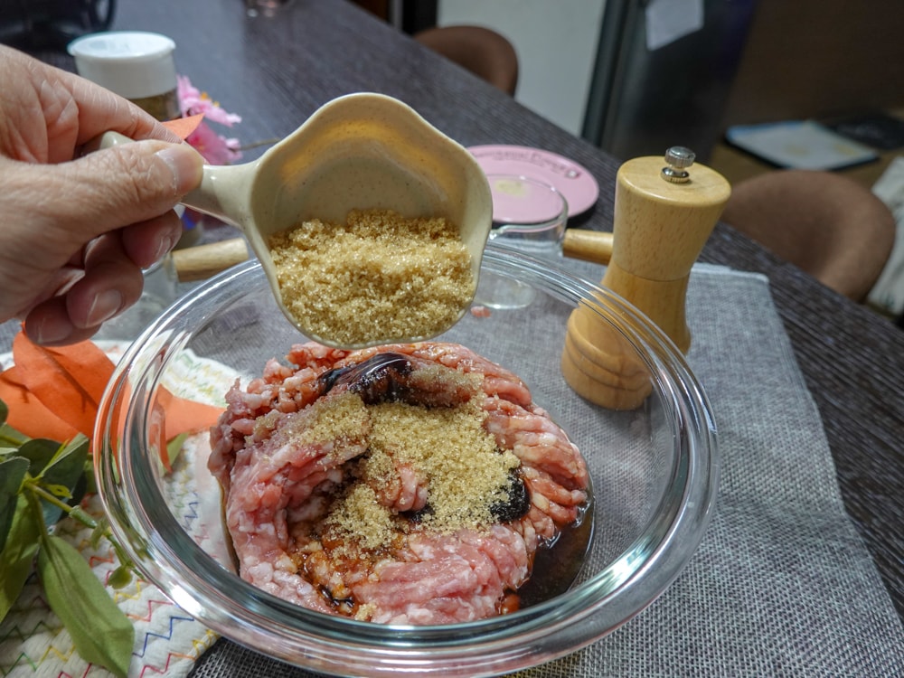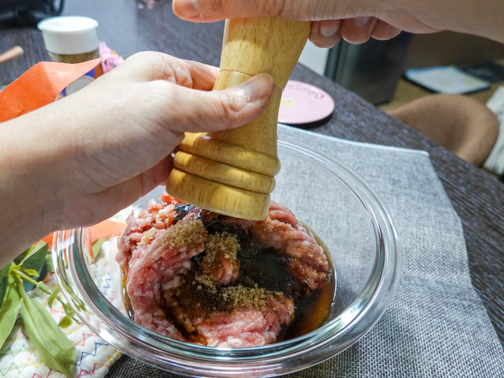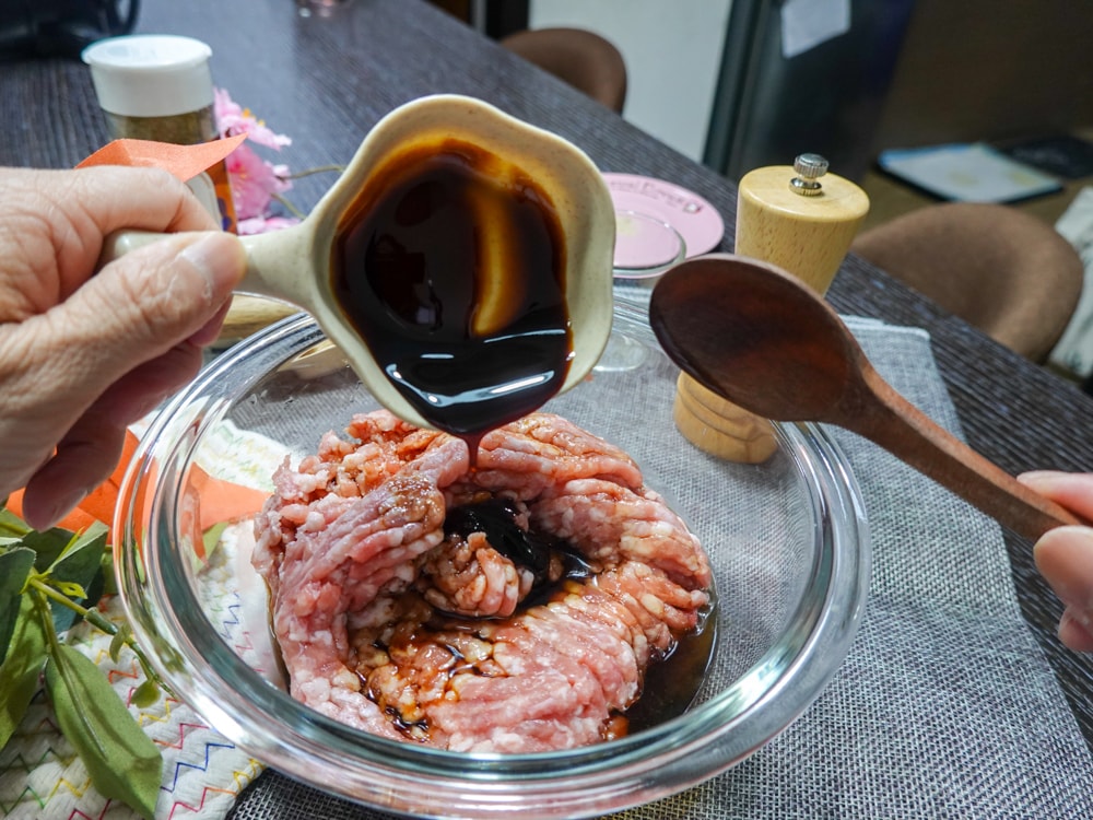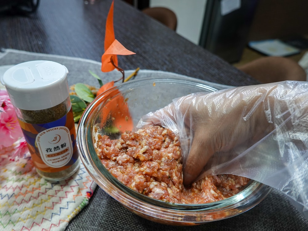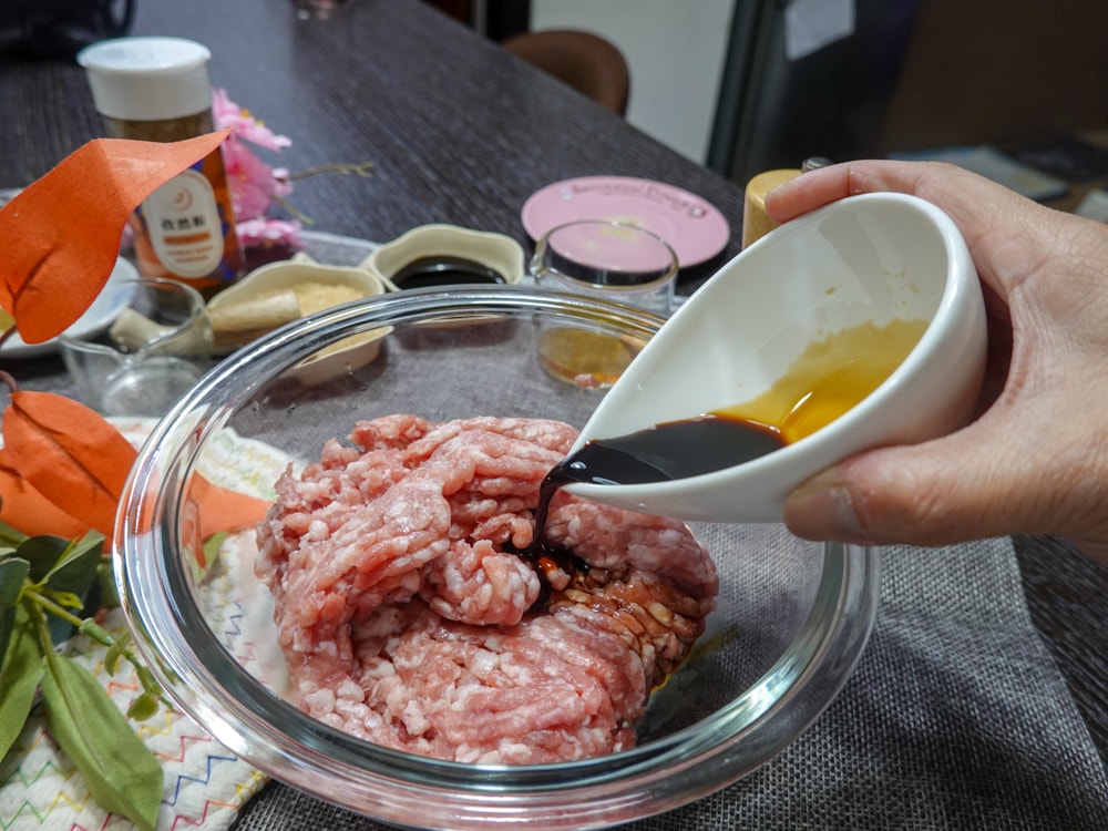 3.調味料加齊後,與絞肉均勻攪拌至出筋有黏性即可(絞肉呈現互相黏著狀即是出筋狀態)