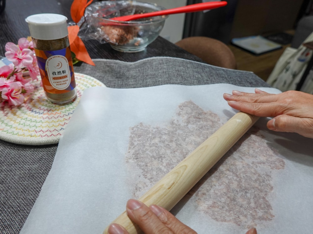 6.放一張烘焙紙於上方開始用桿麵棍均勻攤開約0.3cm厚度,此時烤箱可先預熱160度