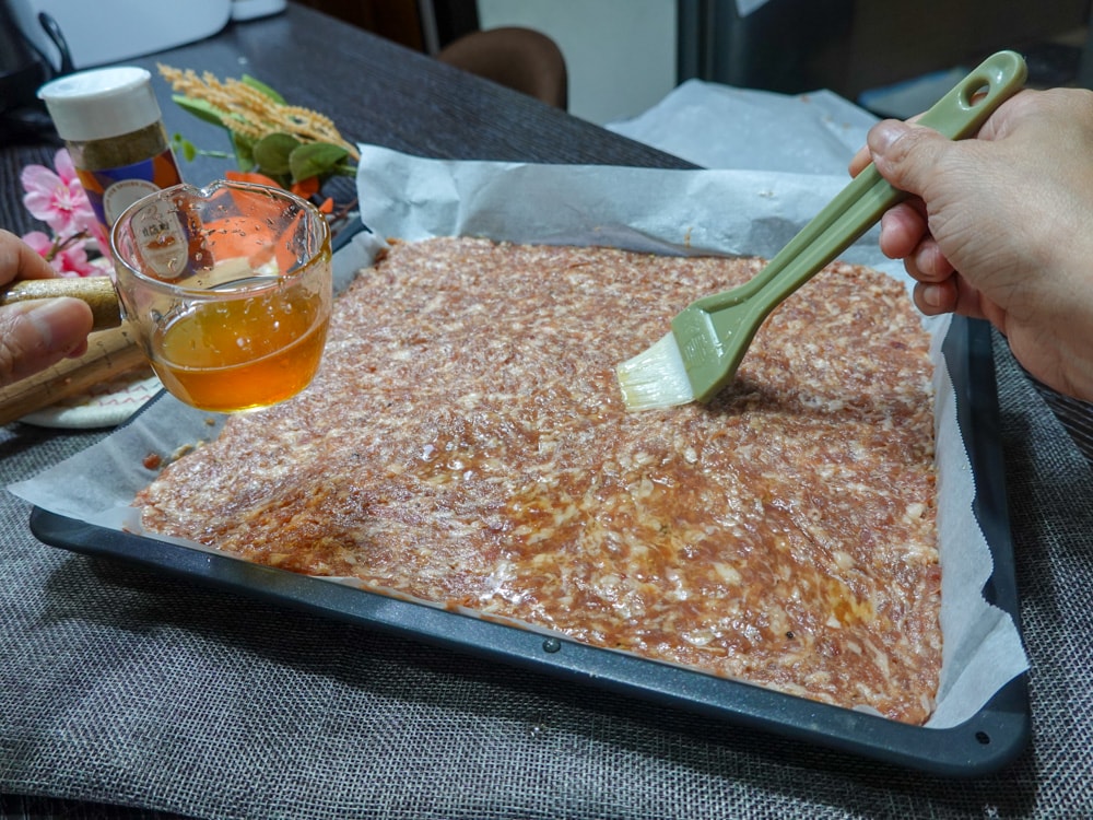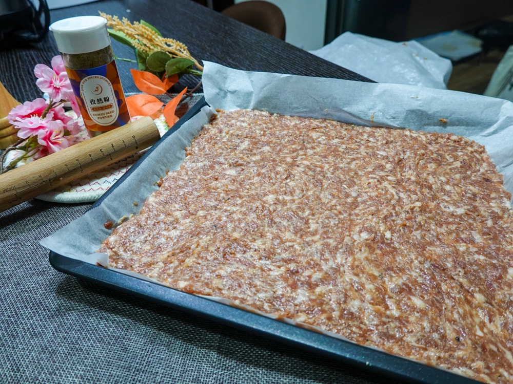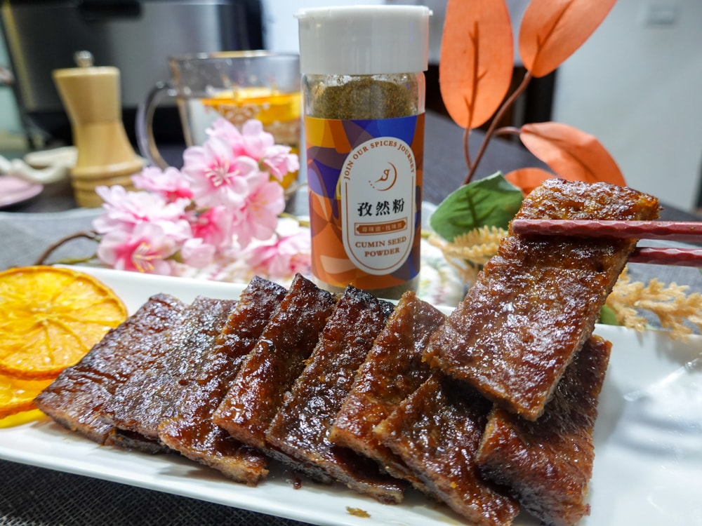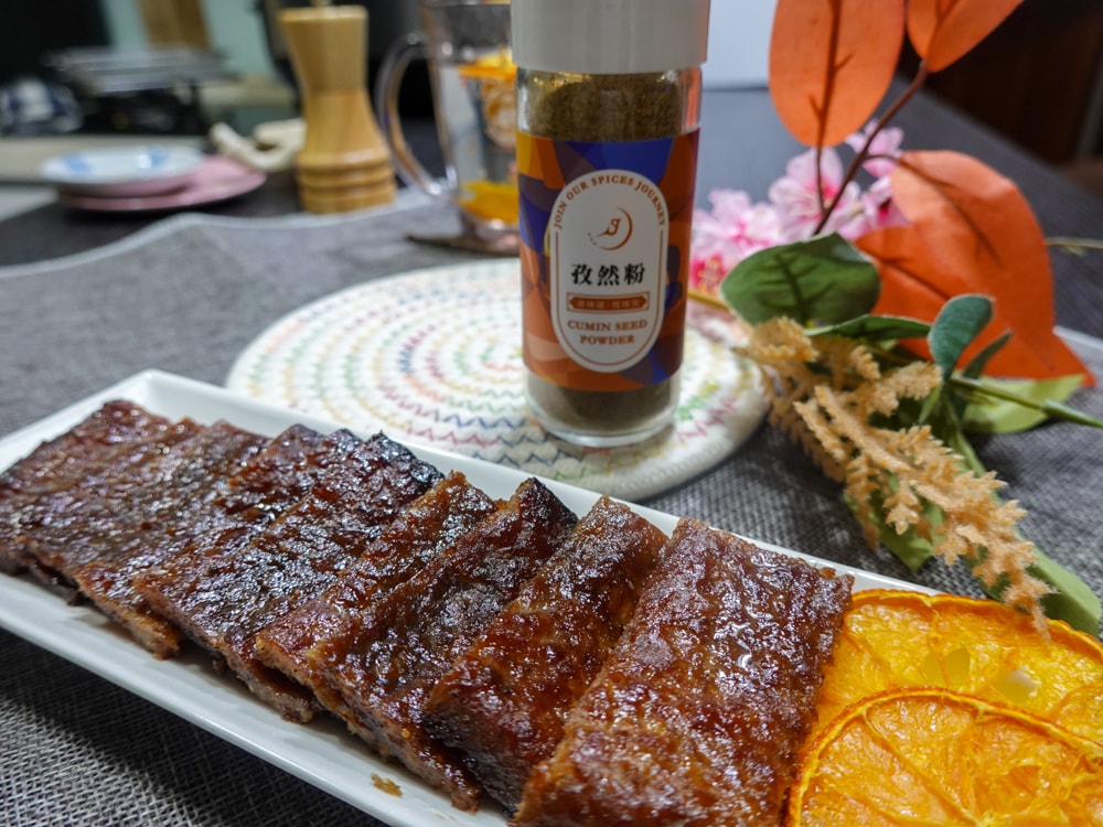 完成後的肉干無論是當零食吃,或是下酒菜都好適合。原味的蜜汁肉干已經相當滿意,這次加入孜然風味就中了妮姊的口味,一片接著一片。隔天甚至拿來夾土司吃,直說下次要再做多一點。