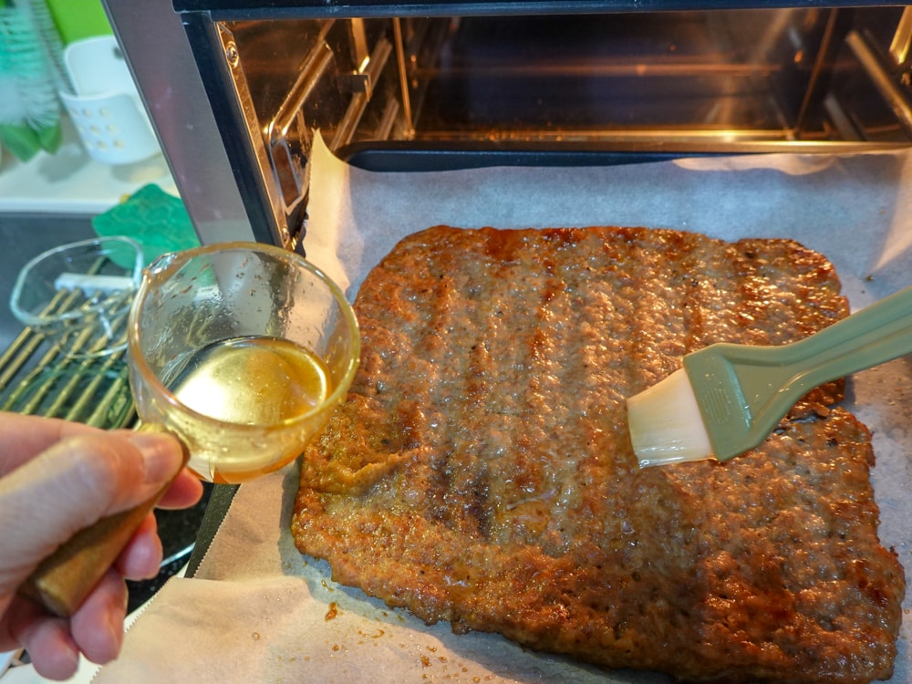 8.倒掉肉汁換烘焙紙,再翻面塗蜂蜜水入烤箱160度上下火10分鐘,出爐後切片就完成囉。
