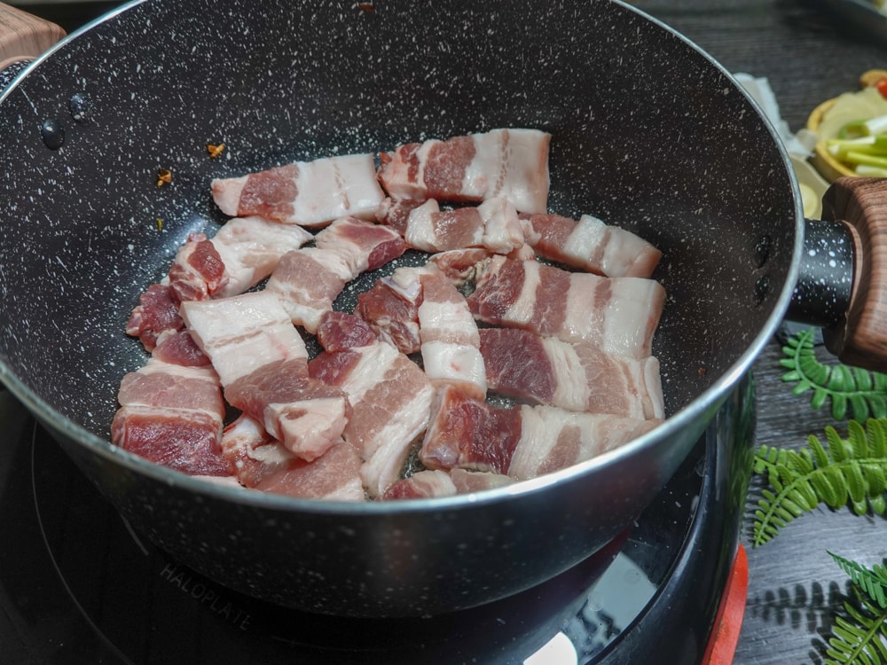 3.將五花肉撈起後,利用五花肉釋放的豬油與辛香料爆香