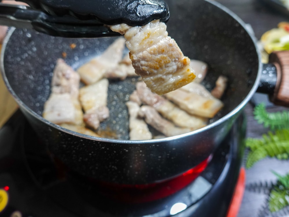 我個人非常喜歡使用萬用鍋烹調料理,快速方便且不用顧火,對於時間不夠用的我就是一大福音!所以材料只要調味拌炒好,直接移到萬用鍋來繼續下半場的烹調,我就可以輕鬆準備下一道菜啦。