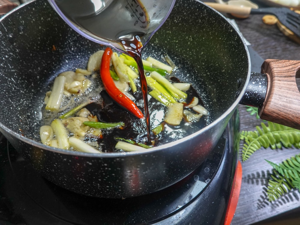 4.爆香後倒入醬油,拌炒到醬油香氣散出,讓辛香料與醬油、豬油徹底融合在一起