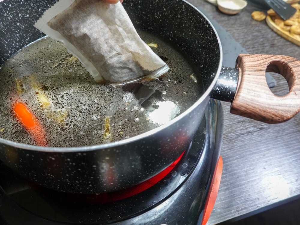 香料包依個人喜好調整入鍋悶煮時間,我個人習慣悶煮約1/2時間就撈起,有增添風味就好。