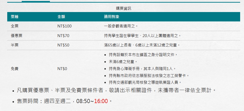 - 免費:6歲以下、左鎮區居民、持有身心障礙手冊及其陪同者一人..(詳見下表)