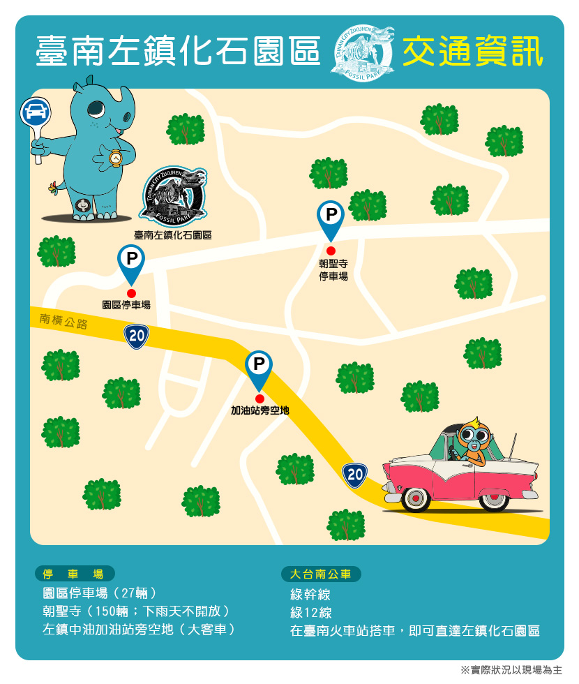 - 大眾運輸:由臺南火車站前搭乘大臺南公車綠幹線,走臺20線省道經過新化至 左鎮化石園區站下車。