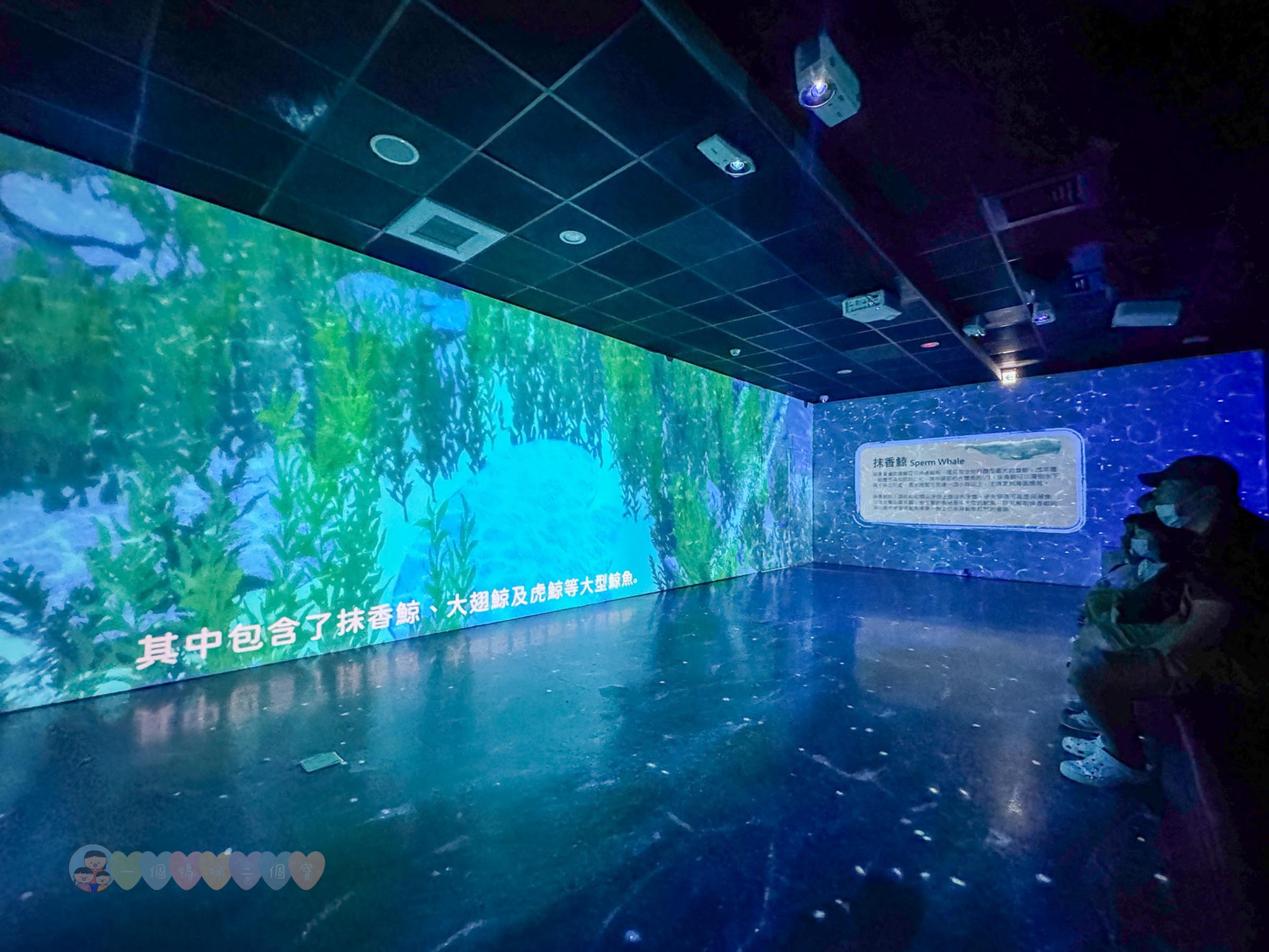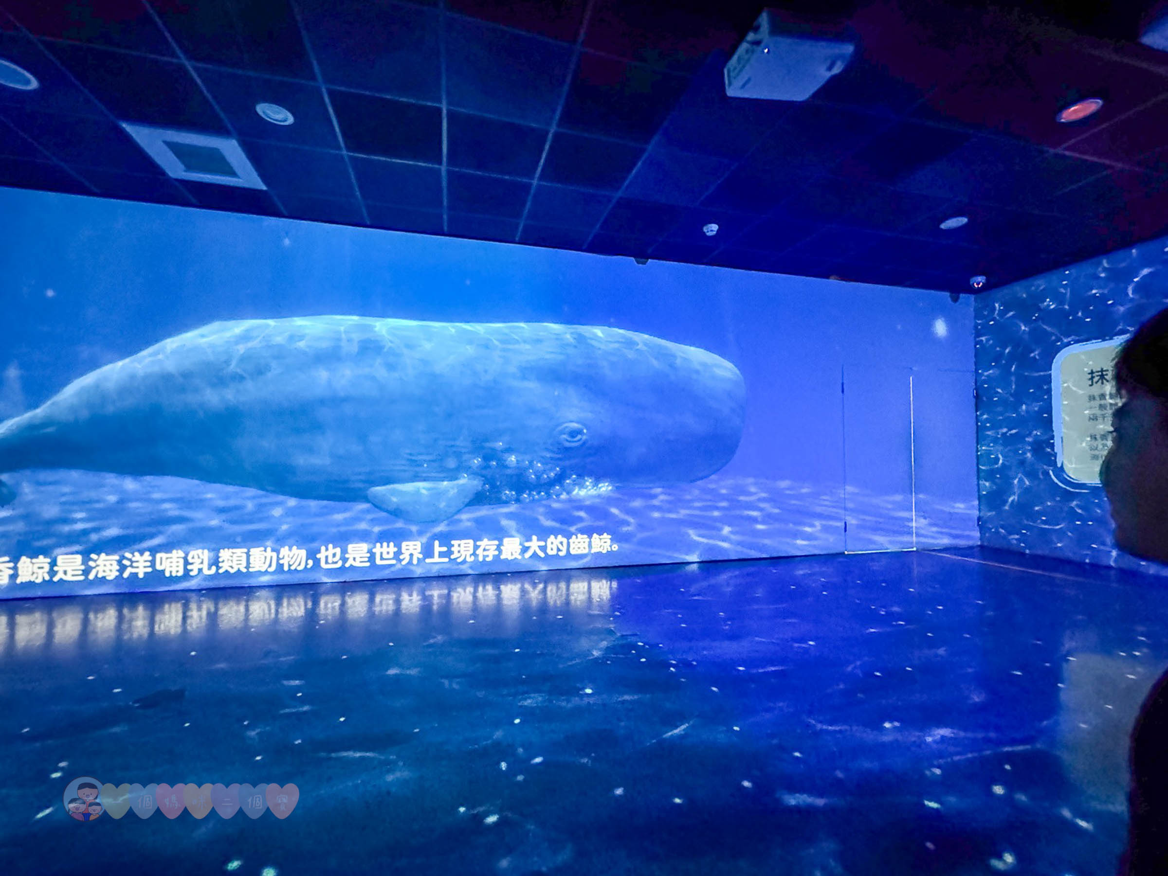 館方運用投影技術,帶領觀眾沉浸式體驗潛入海底的旅人,與抹香鯨「大寶」一同悠遊海洋、浮出換氣、捕食牠最愛的大王魷魚。