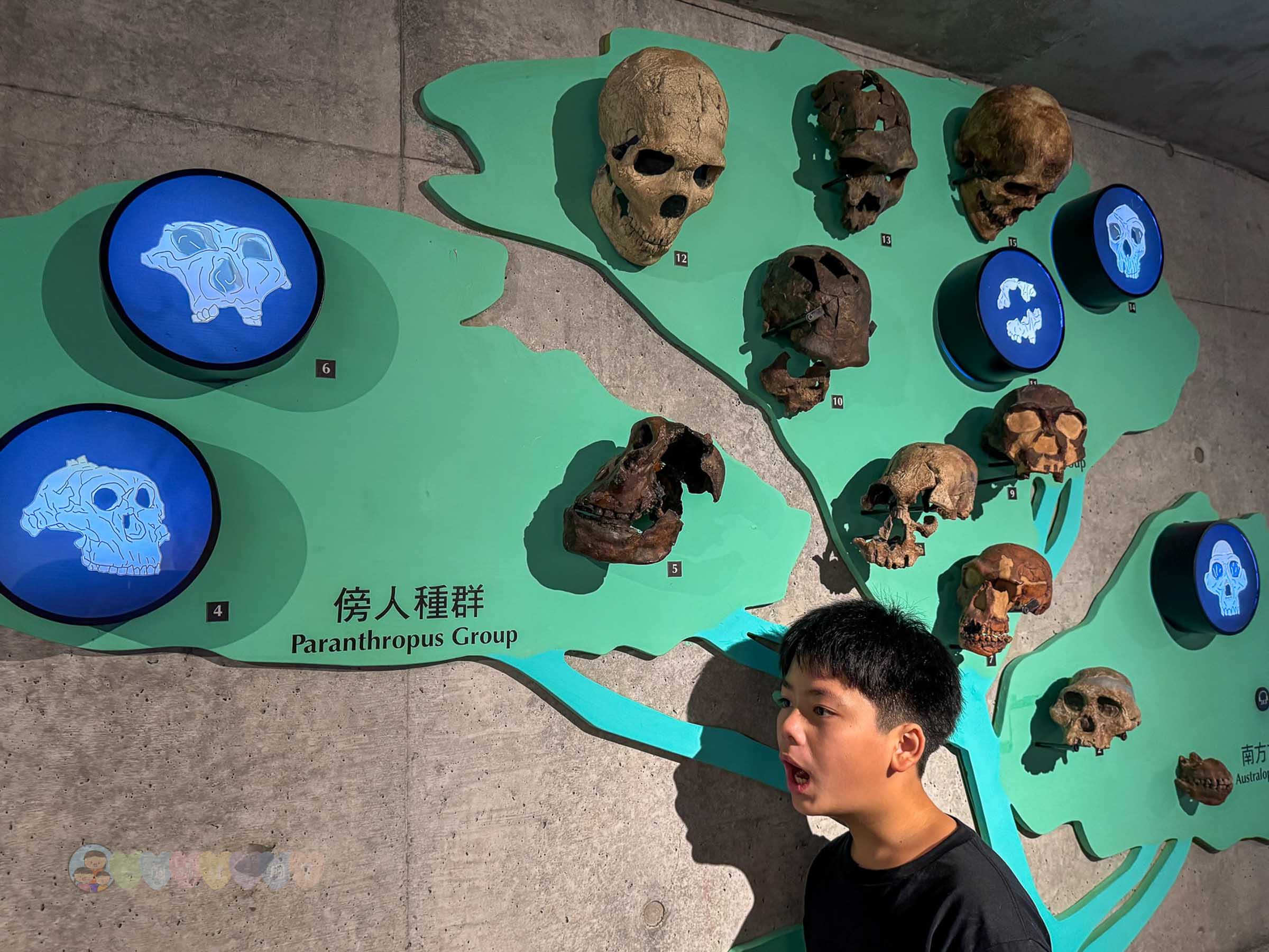 引人注目的人類頭骨化石也是小朋友感到很驚訝地展出之一,調皮的叡哥也來插一腳,應該是「現代人代表」!
