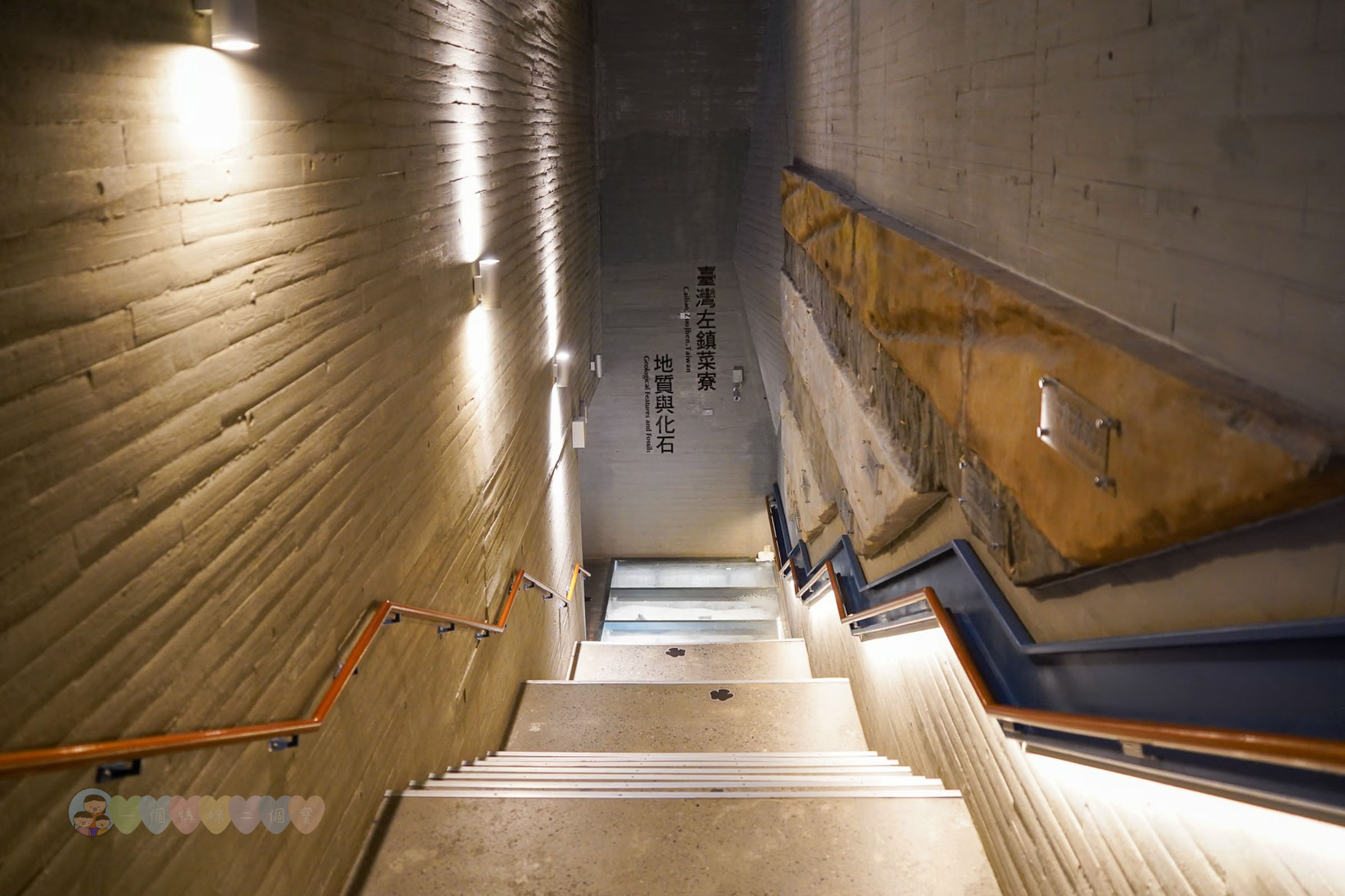 順著指標與樓梯往下走可以看見腳底下的化石,以及扶手處的地層剖面,埋藏左鎮菜寮各種貝類及碎骨化石。