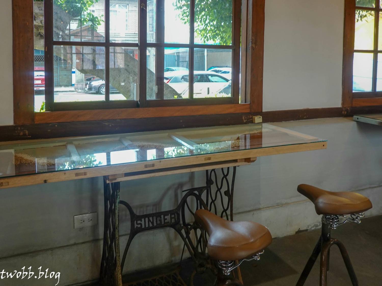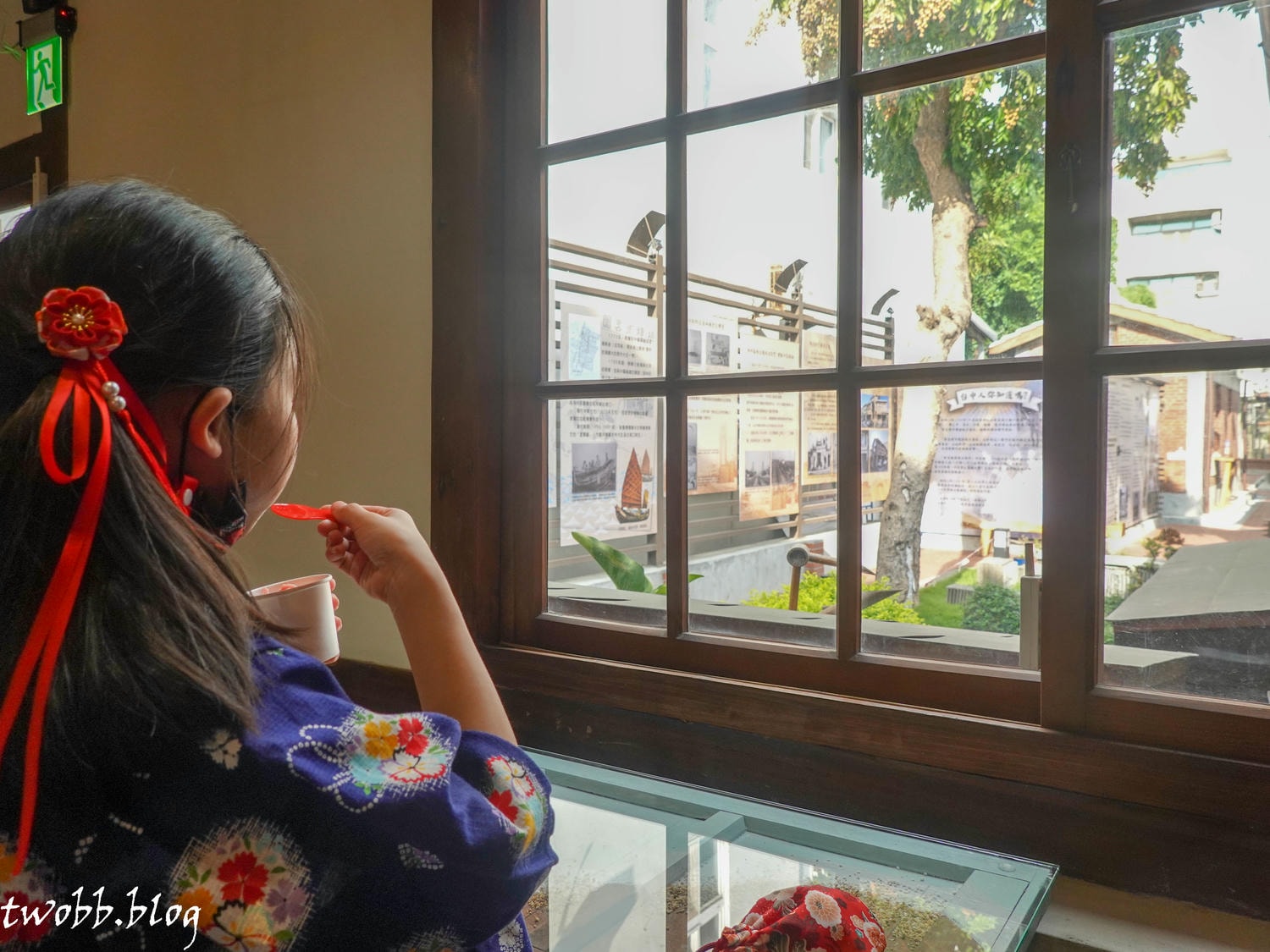 坐在窗旁一邊吃著冰淇淋,看著園區內的景象及來往的遊客,