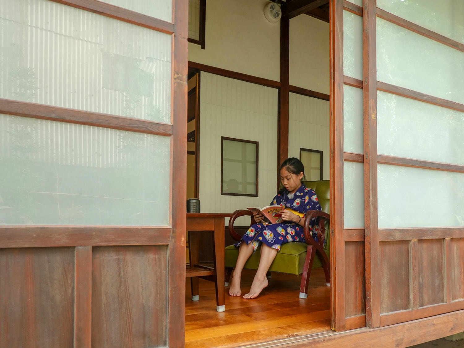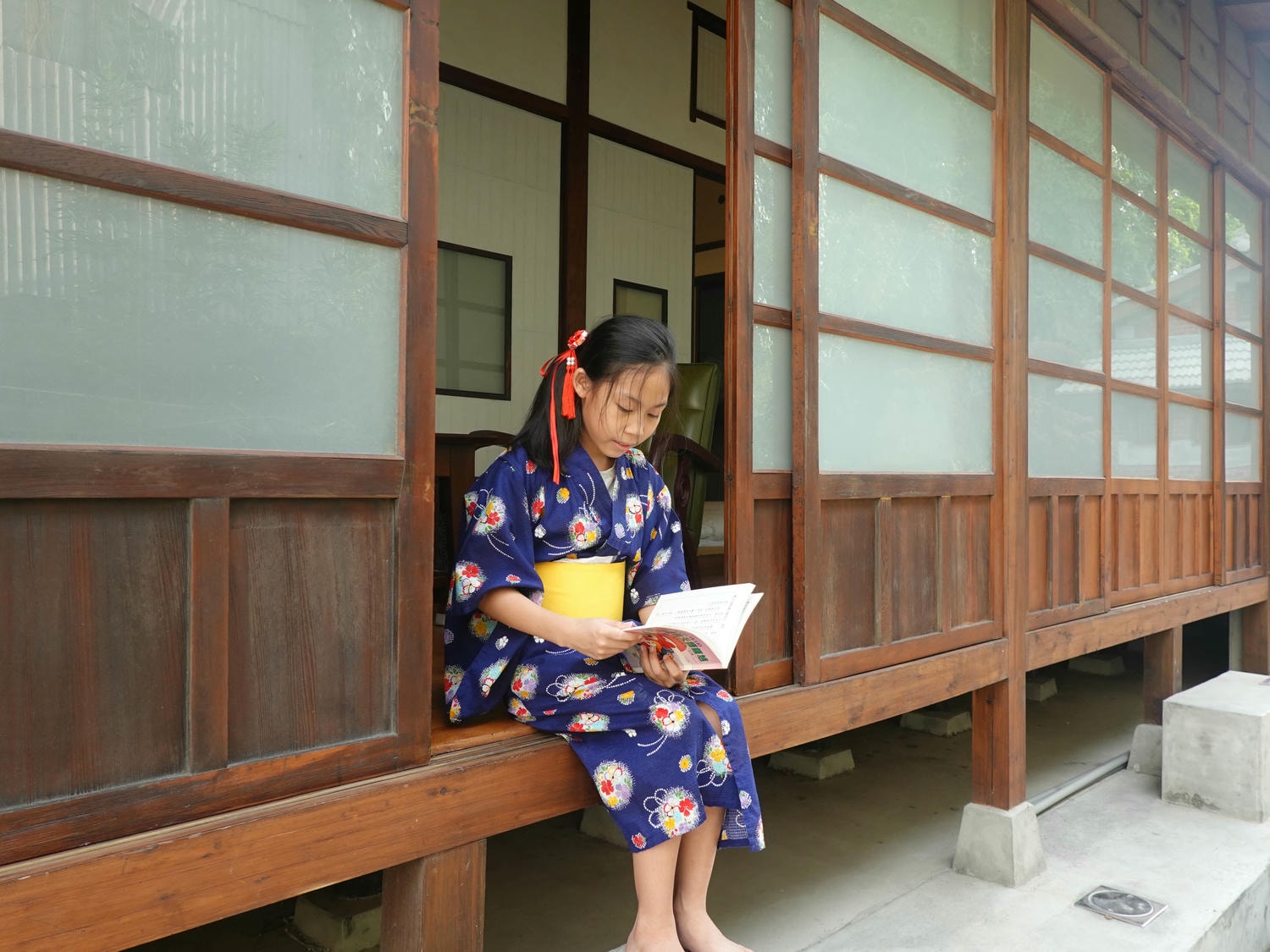 在專屬的亭院門邊,挑選一本喜歡的書,