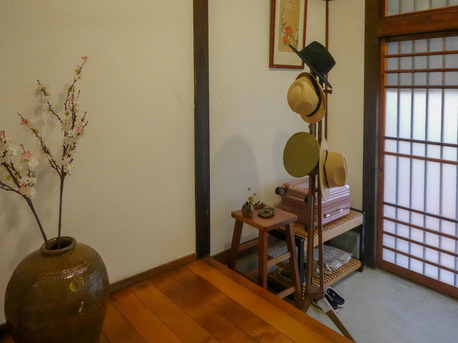 玄關衣帽架上,已經先擺放了看起來相當應時的帽子(除了草帽是我家自己的)