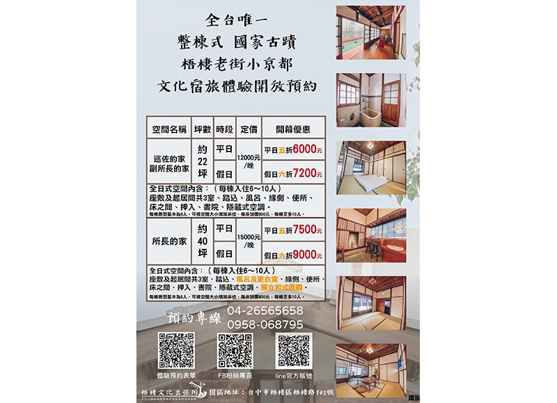 不同於台中市區的繁華,是為臺灣四大中部沿海城鎮之一的「梧棲」,遊客來到這,首先想到就是漁港以及老街。而「梧棲老街」不若一般市集林立的商業氣息,就像是一條靜詣的的歷史穩穩地座落在這。少了一些商業再造的空間,某種層面上算是有些可惜。也或許這樣的沉穩才顯得是一座真實的「老街」。老街上知名的古蹟除了「朝元宮」,還有近期復舊改造成功的「梧棲文化出張所」,一座見證了日本統治時期二戰後國民政府時期的古蹟,如今在時代的更迭及文化資產活化下,搖身一變成為結合文化傳遞、餐飲、市集以及民宿的園區,走!今天到出張所住一晚,感受一幢老屋想跟我們說的故事。