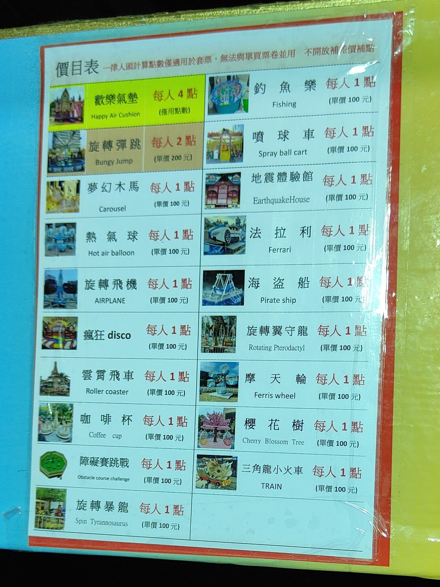 除了旋轉彈跳2點、氣球城堡4點,其他17遊樂設施都使用1點歡樂套票。